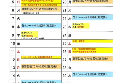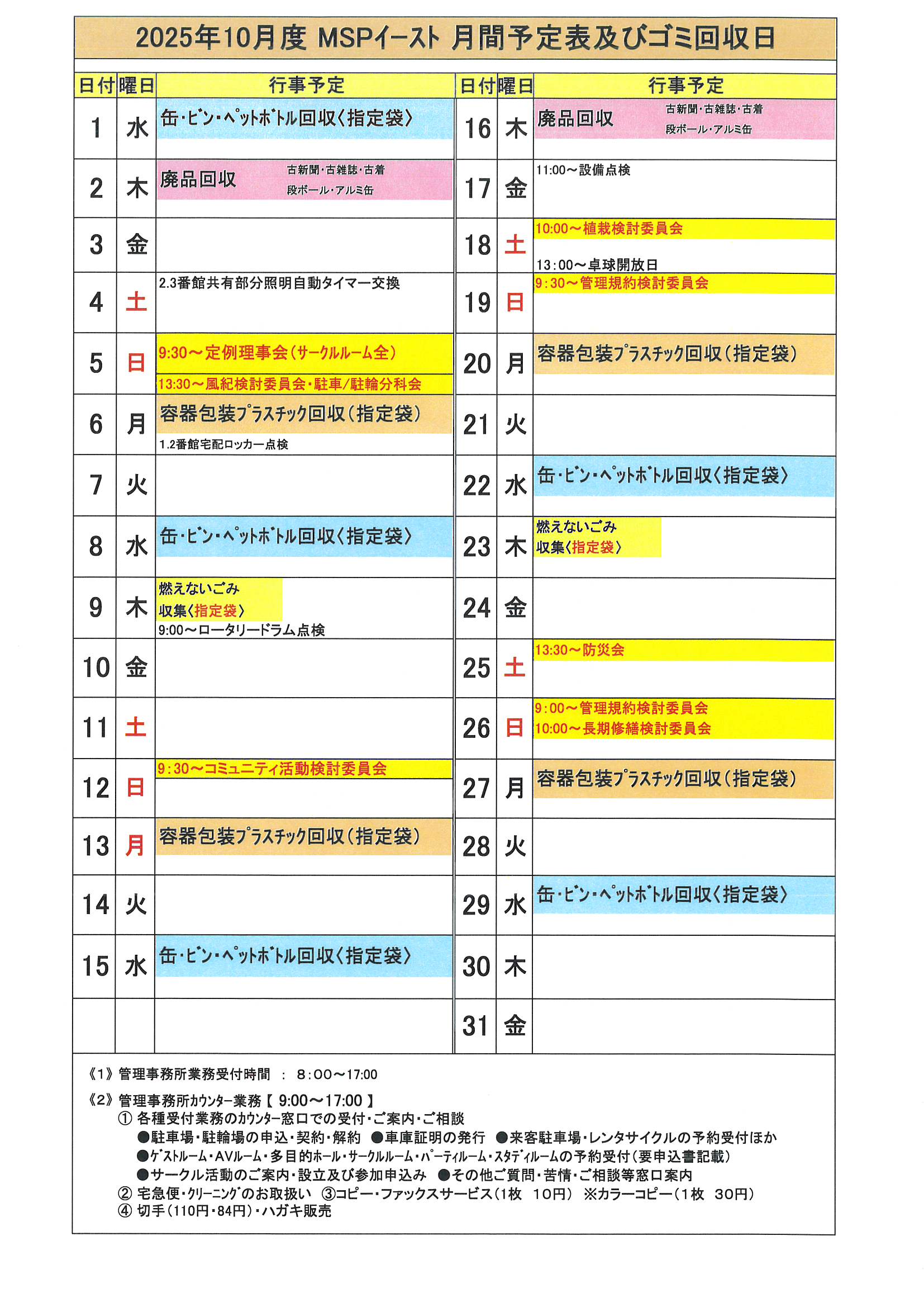 2025年10月MSPイースト月間予定表及びゴミ回収日