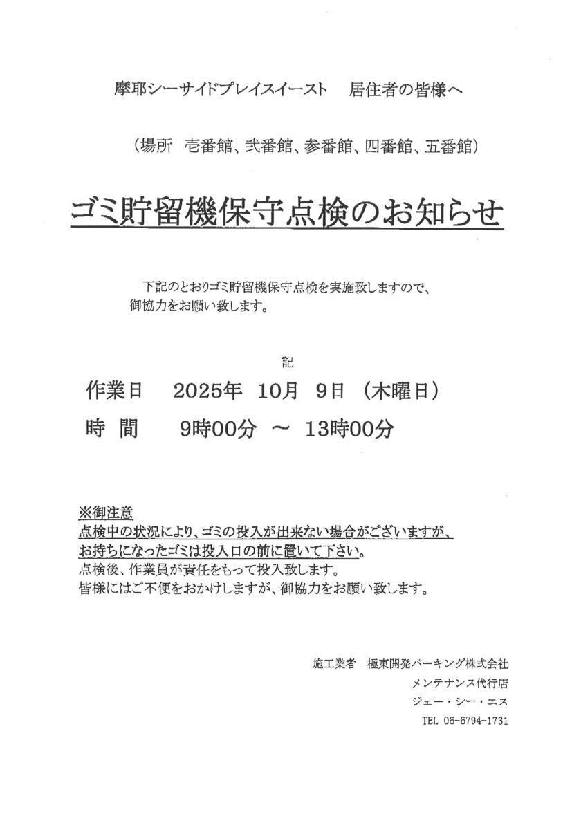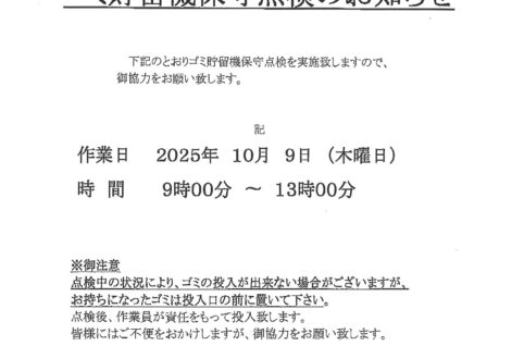 ゴミ貯留機保守点検のお知らせ