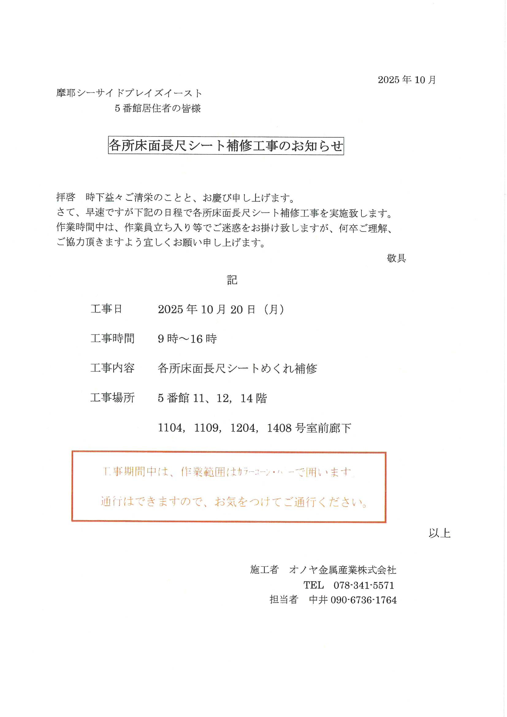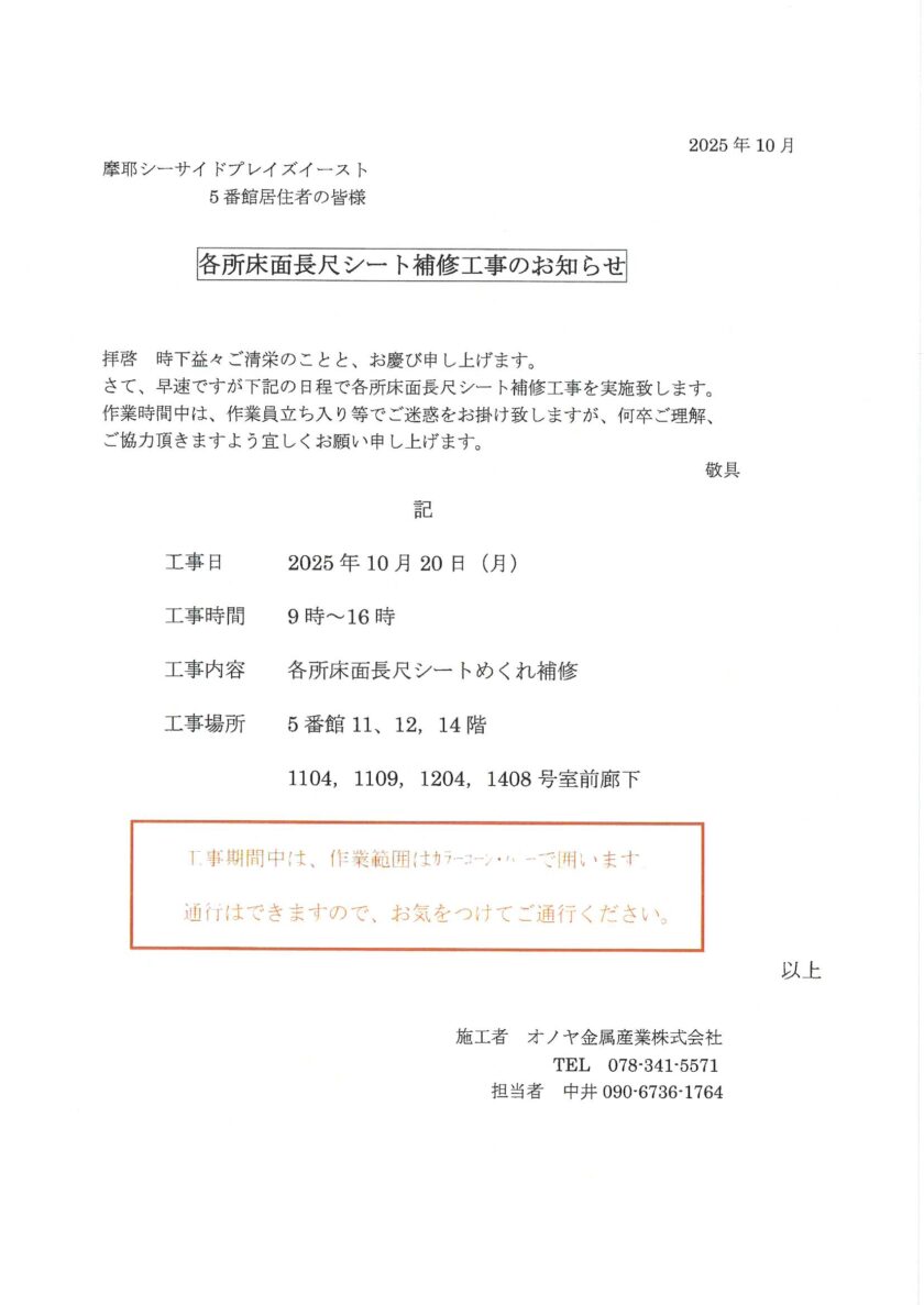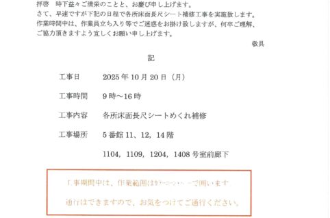 [5番館]各所床長尺シート補修工事のお知らせ