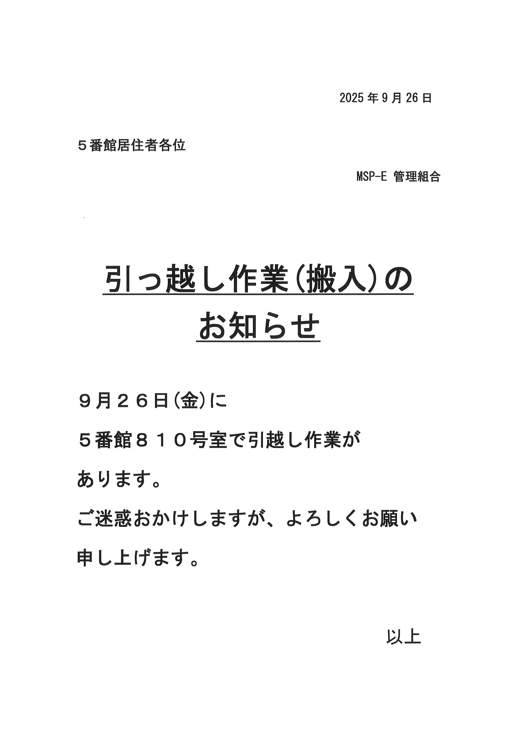 [5番館]引っ越し作業のお知らせ