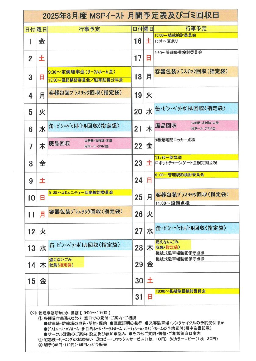 2025年8月度MSPイースト月間予定表及びゴミ回収日