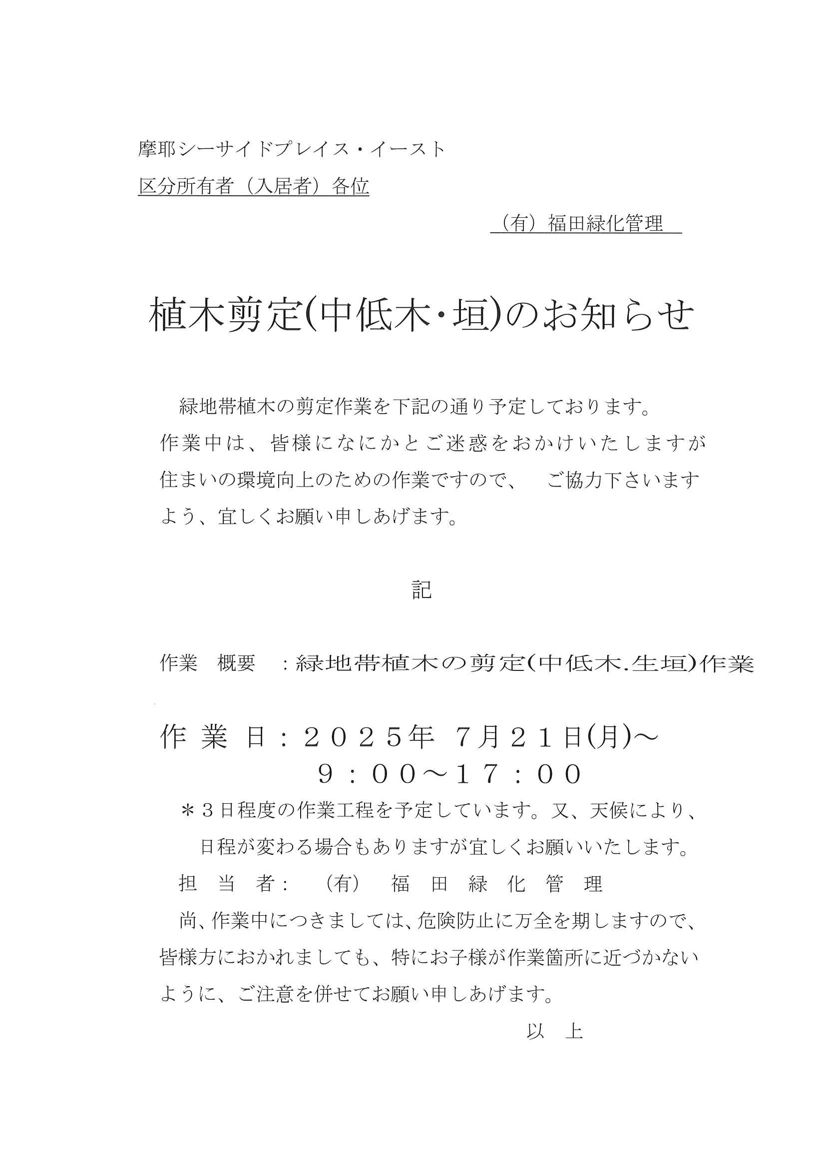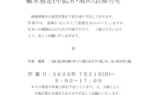 植木剪定(中低木・垣)のお知らせ
