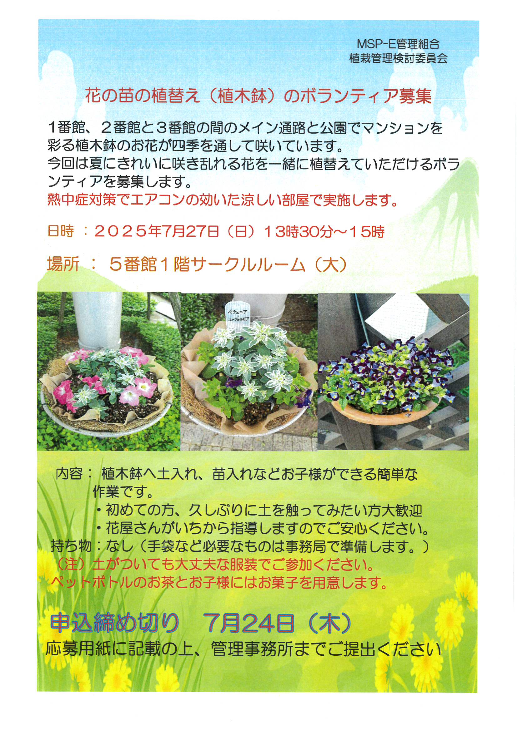花の苗の植替え(植木鉢)のボランティア募集