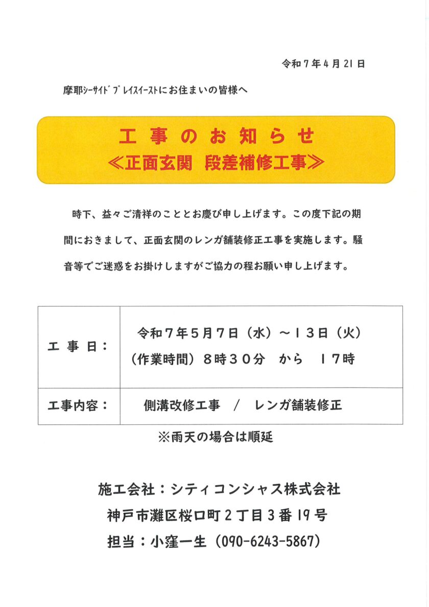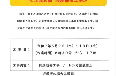 5月7日(水)~13日(火)「正面玄関 段差補修工事のお知らせ」