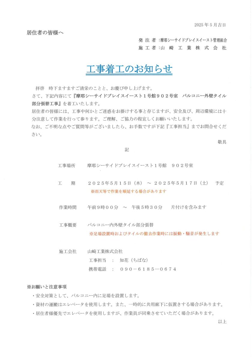 5月15日~1-902号室バルコニー7外壁タイル部分張替工事