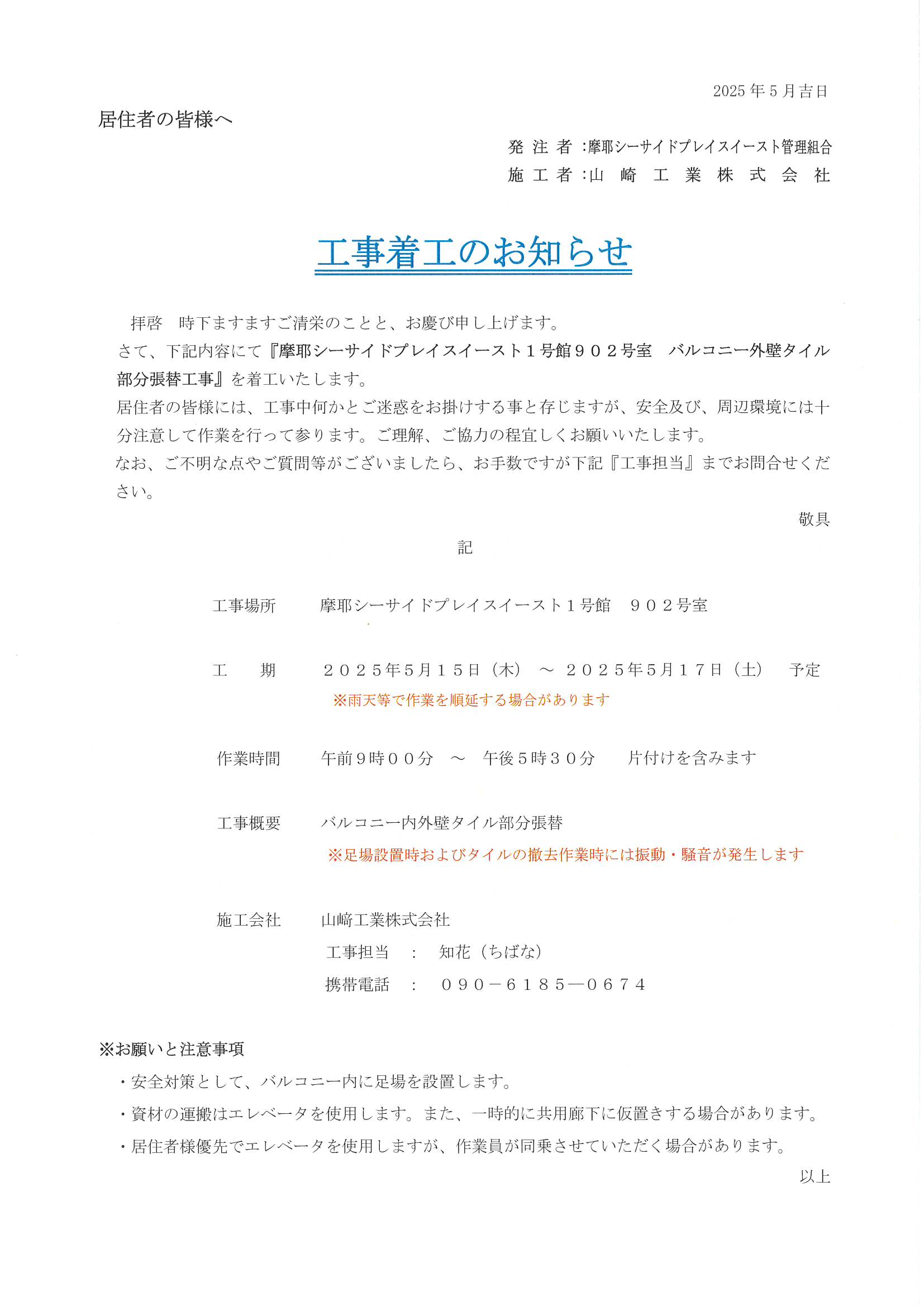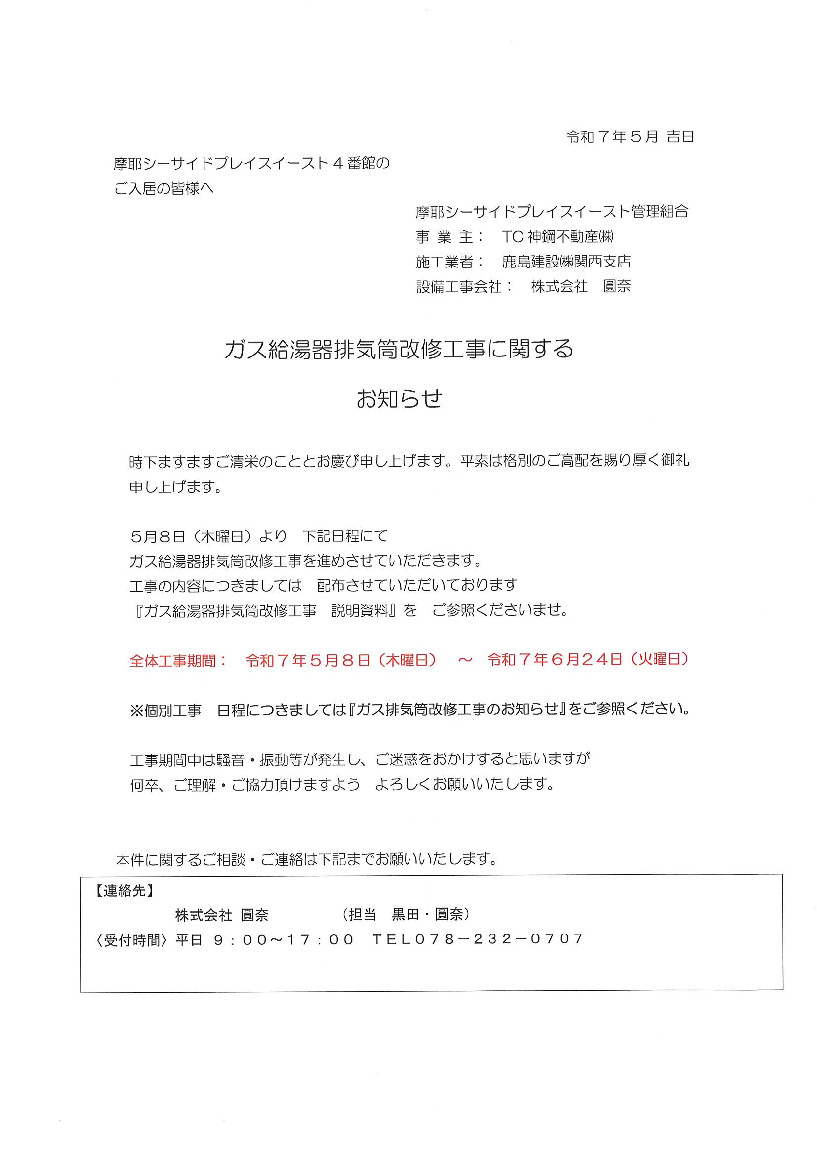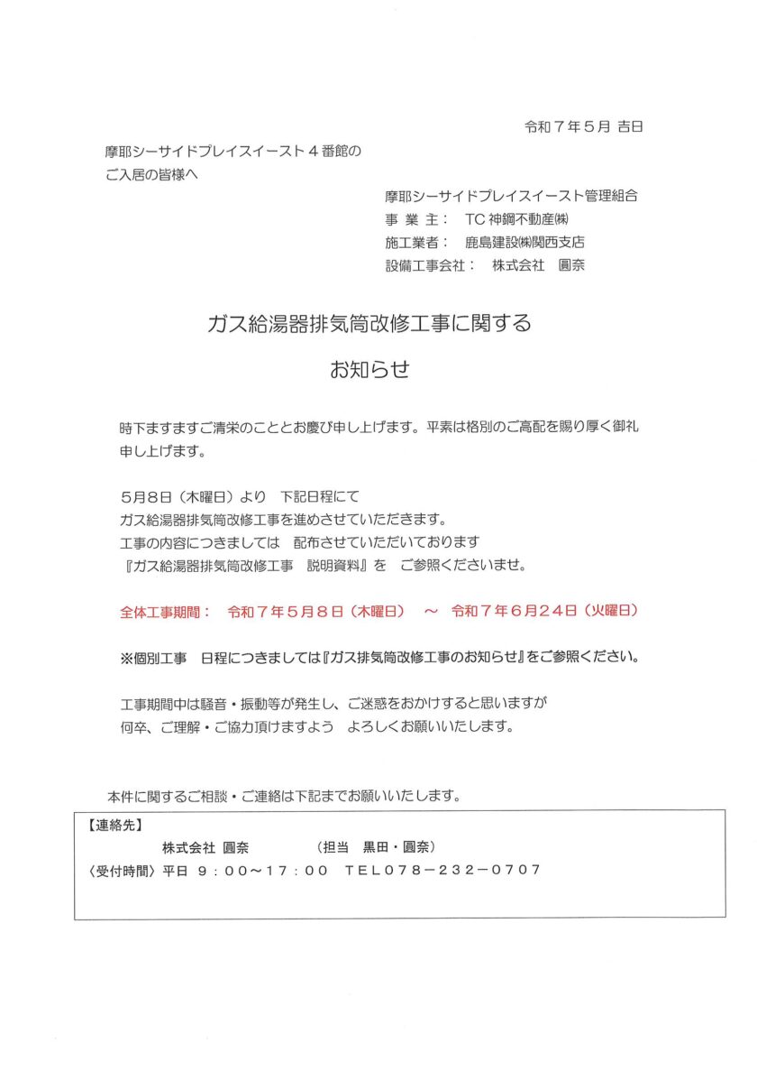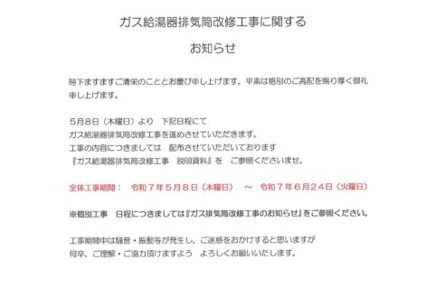 4番館ガス給湯器排気筒改修工事に関するお知らせ