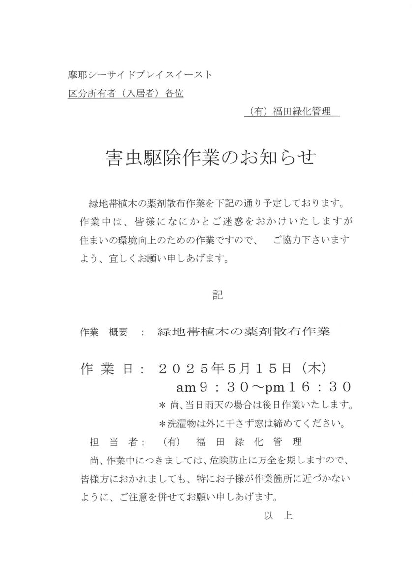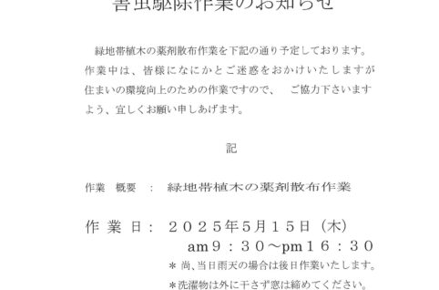 5月15日(木)害虫駆除作業のお知らせ