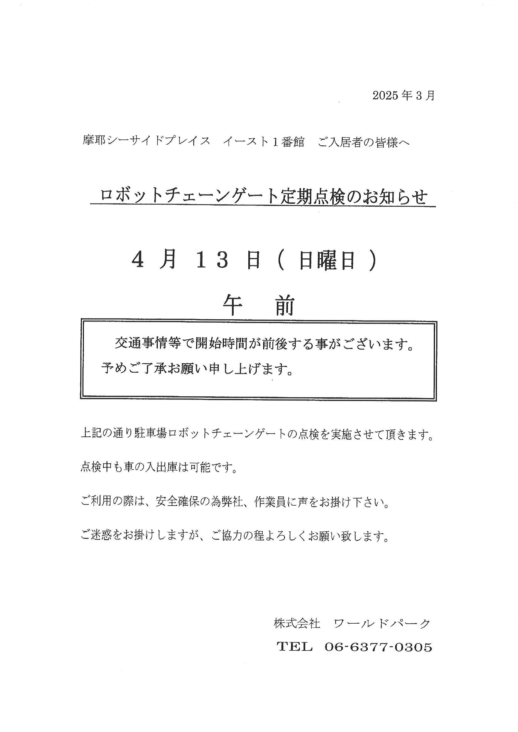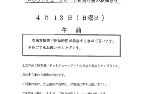 4月13日(日)ロボットチェーンゲート定期点検のお知らせ