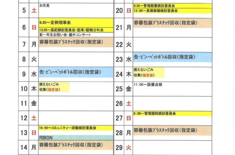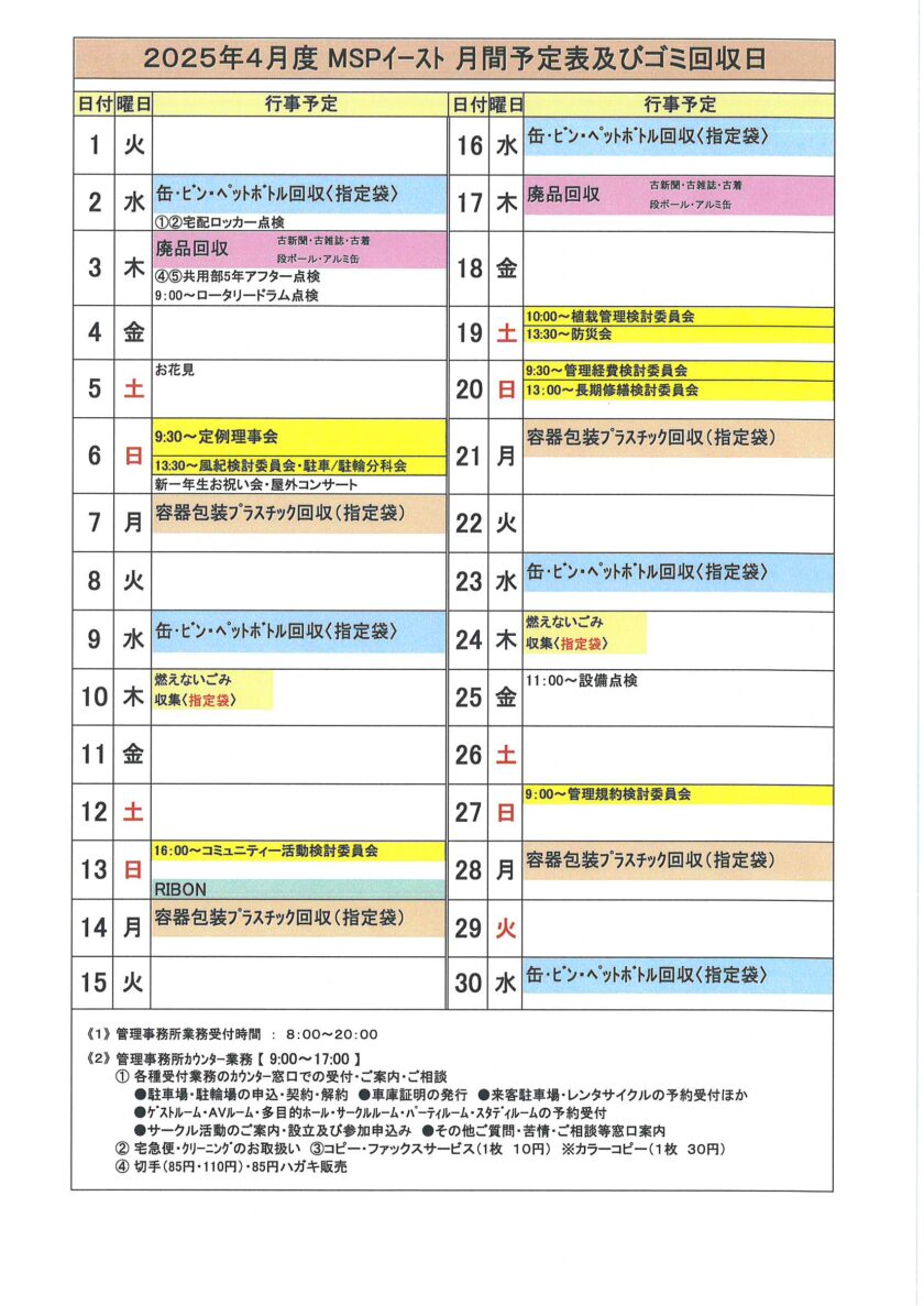 2025年4月度MSP-E月間予定表及びゴミ回収日