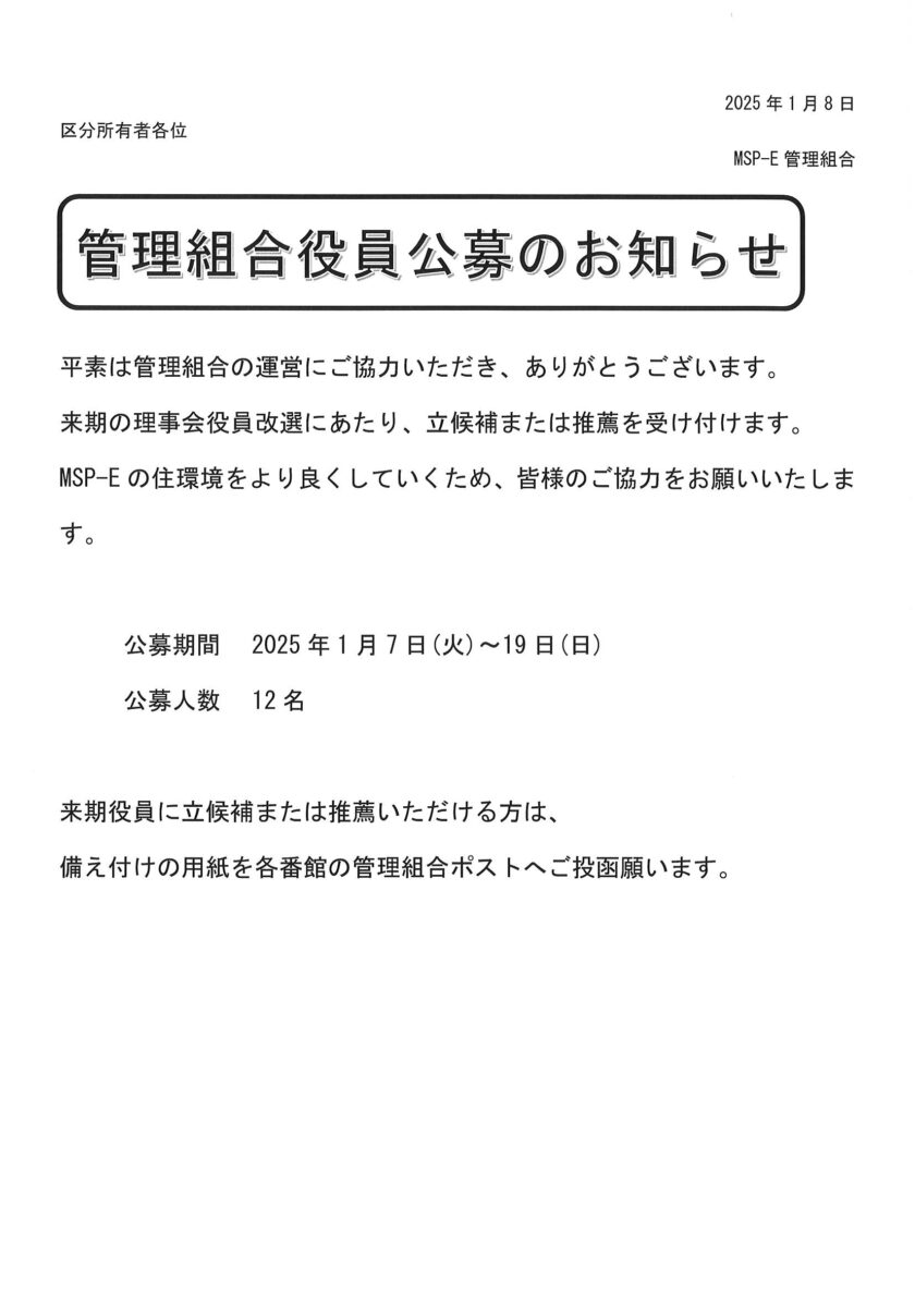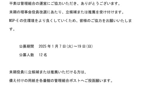 管理組合役員公募のお知らせ/2025年度公募対象役員