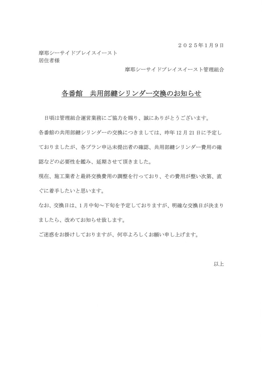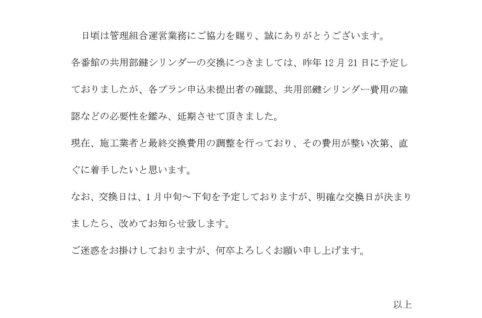 各番館 共用部鍵シリンダー交換のお知らせ