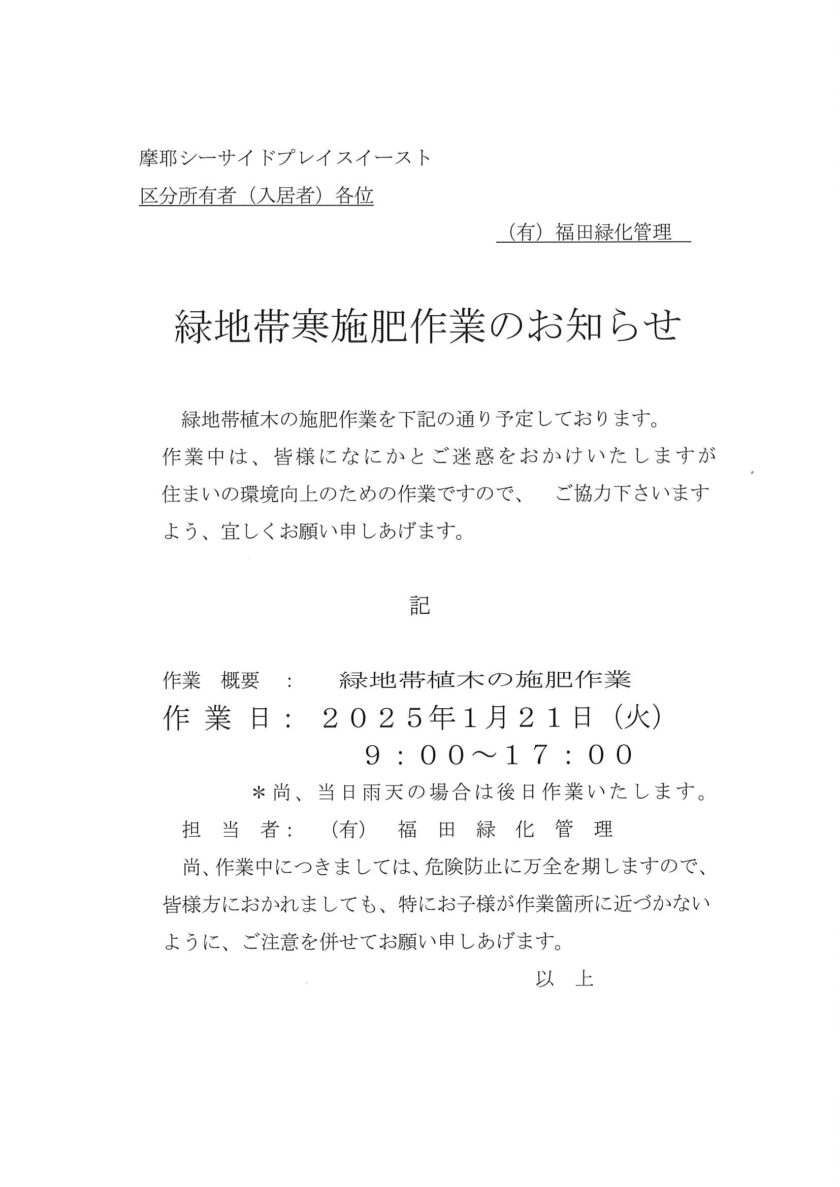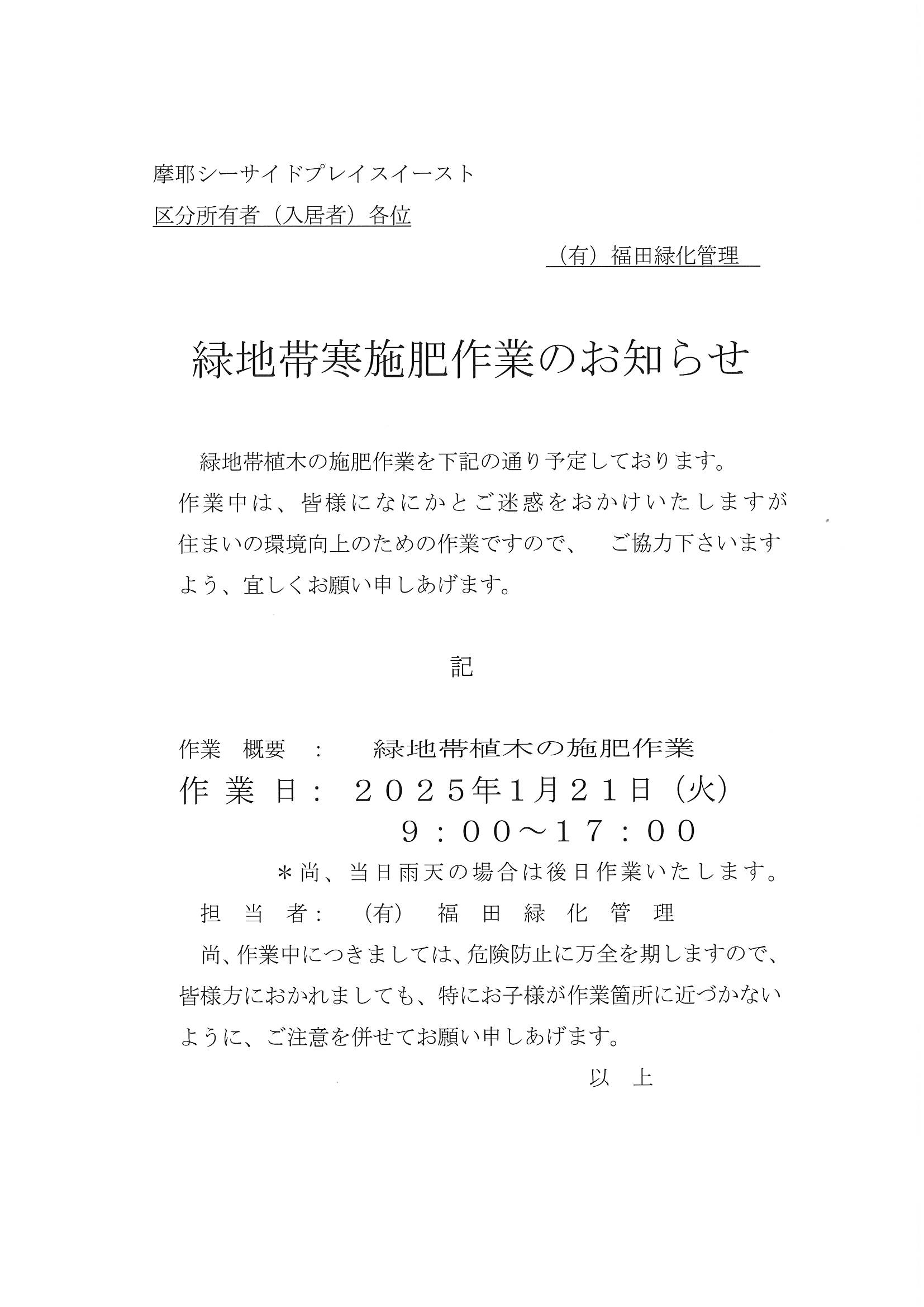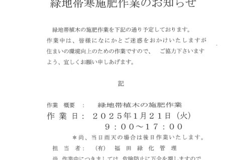 1月21日(火)緑地帯寒施肥作業のお知らせ