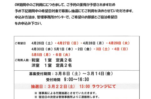 ゲストルーム/ゴールデンウィークご利用者募集