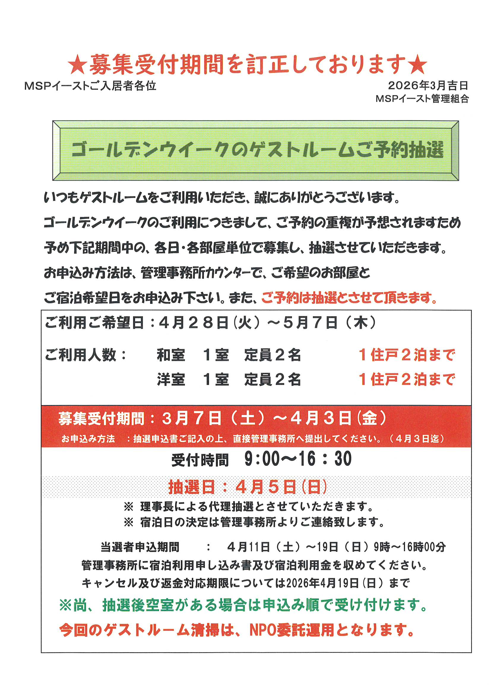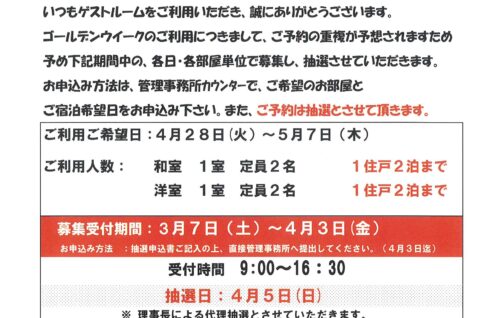 【訂正・募集期間】ゴールデンウィークのゲストルームご予約抽選