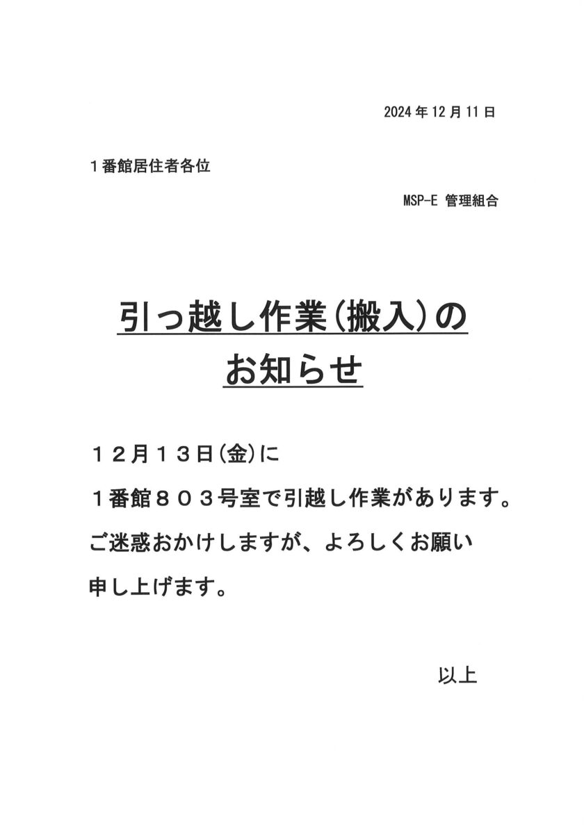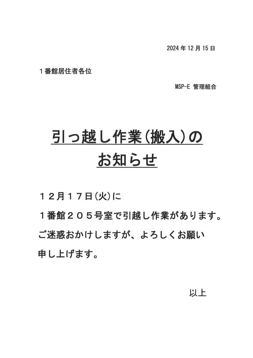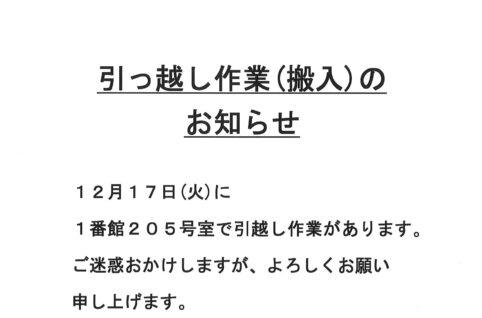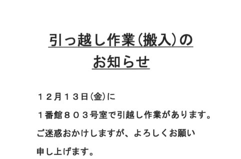 [1番館]引っ越し作業のお知らせ