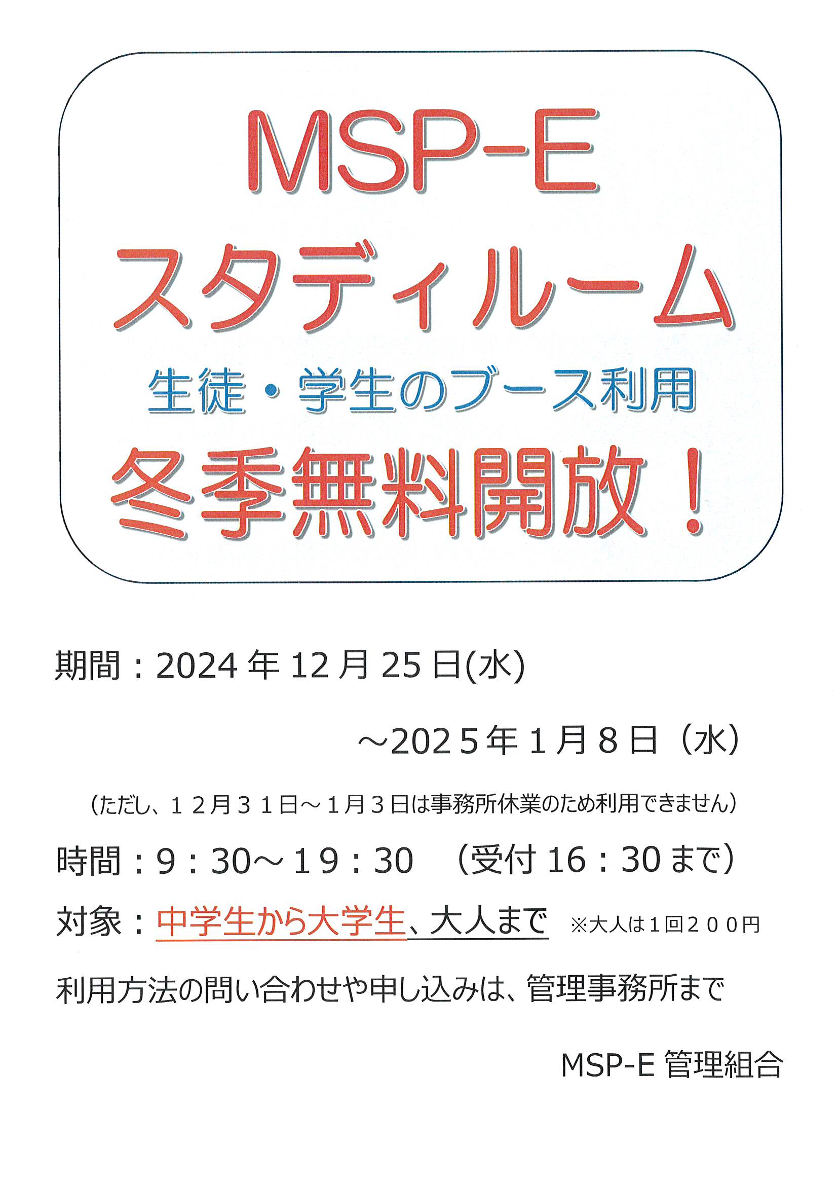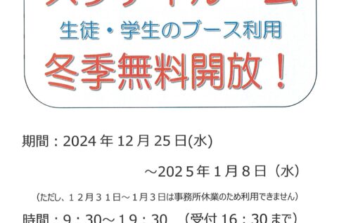 12月25日~1月8日(12月31日~1月3日利用不可)スタディールーム冬季無料開放