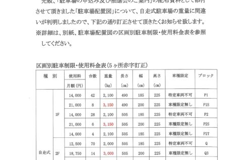 駐車場区画別重量制限サイズ【訂正】のお知らせ