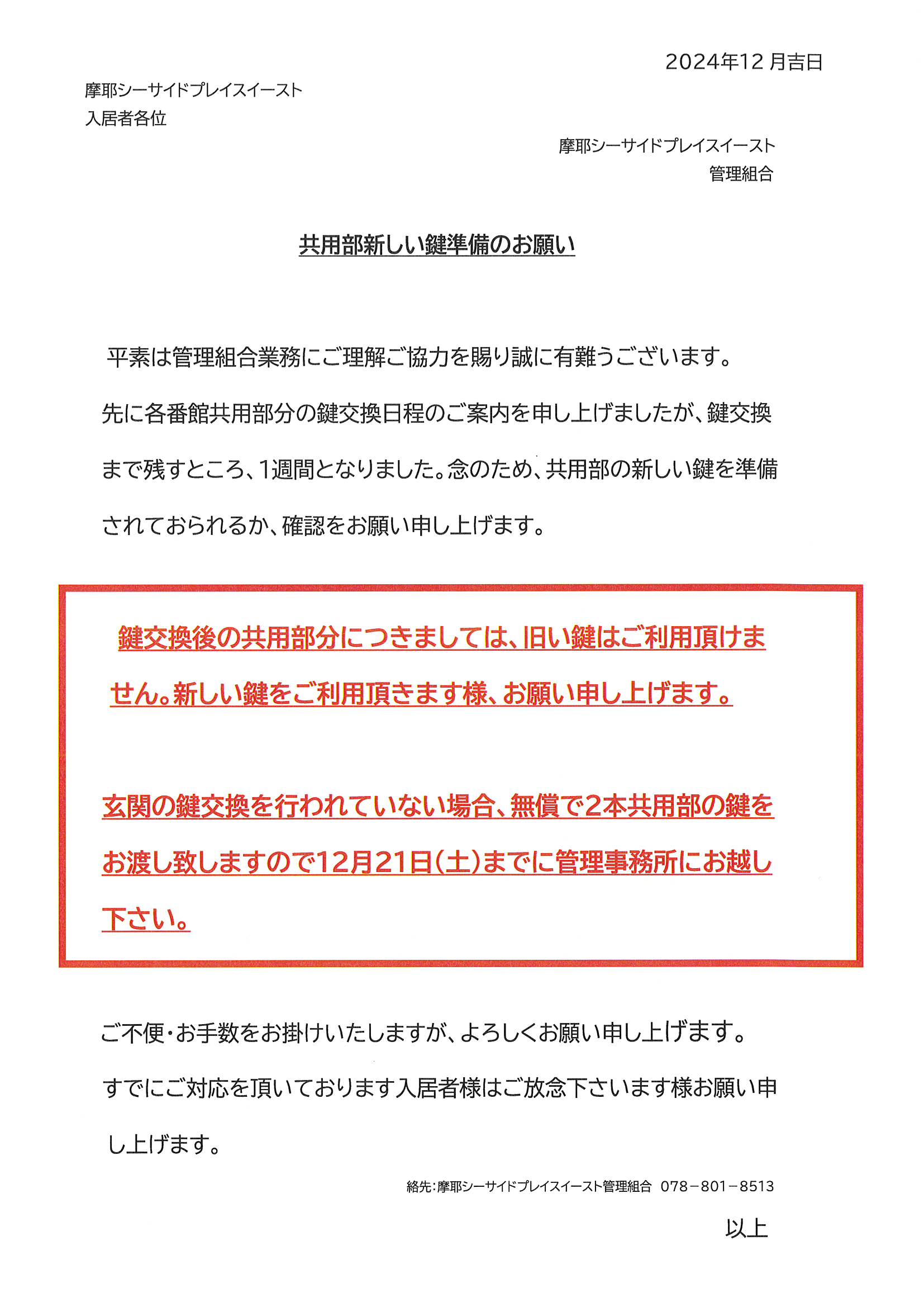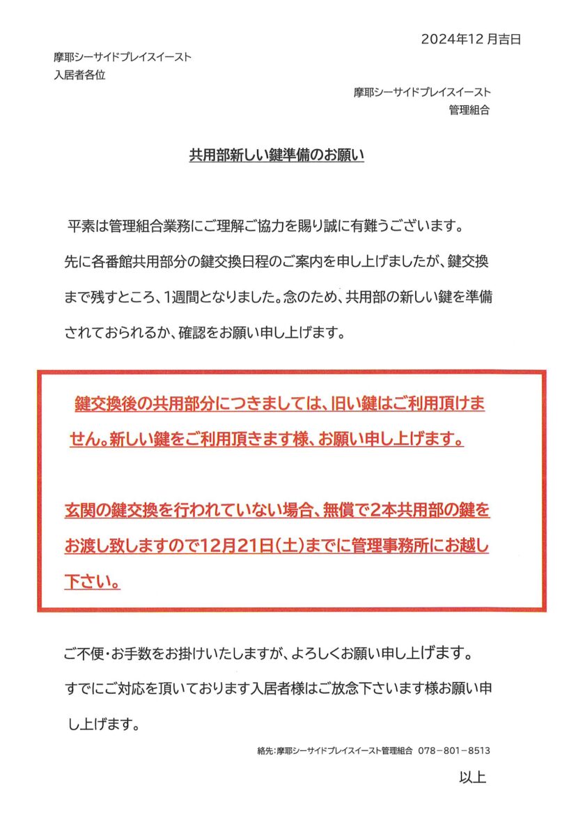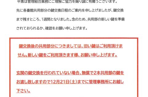 共用部新しい鍵準備のお願い 12月21日交換実施