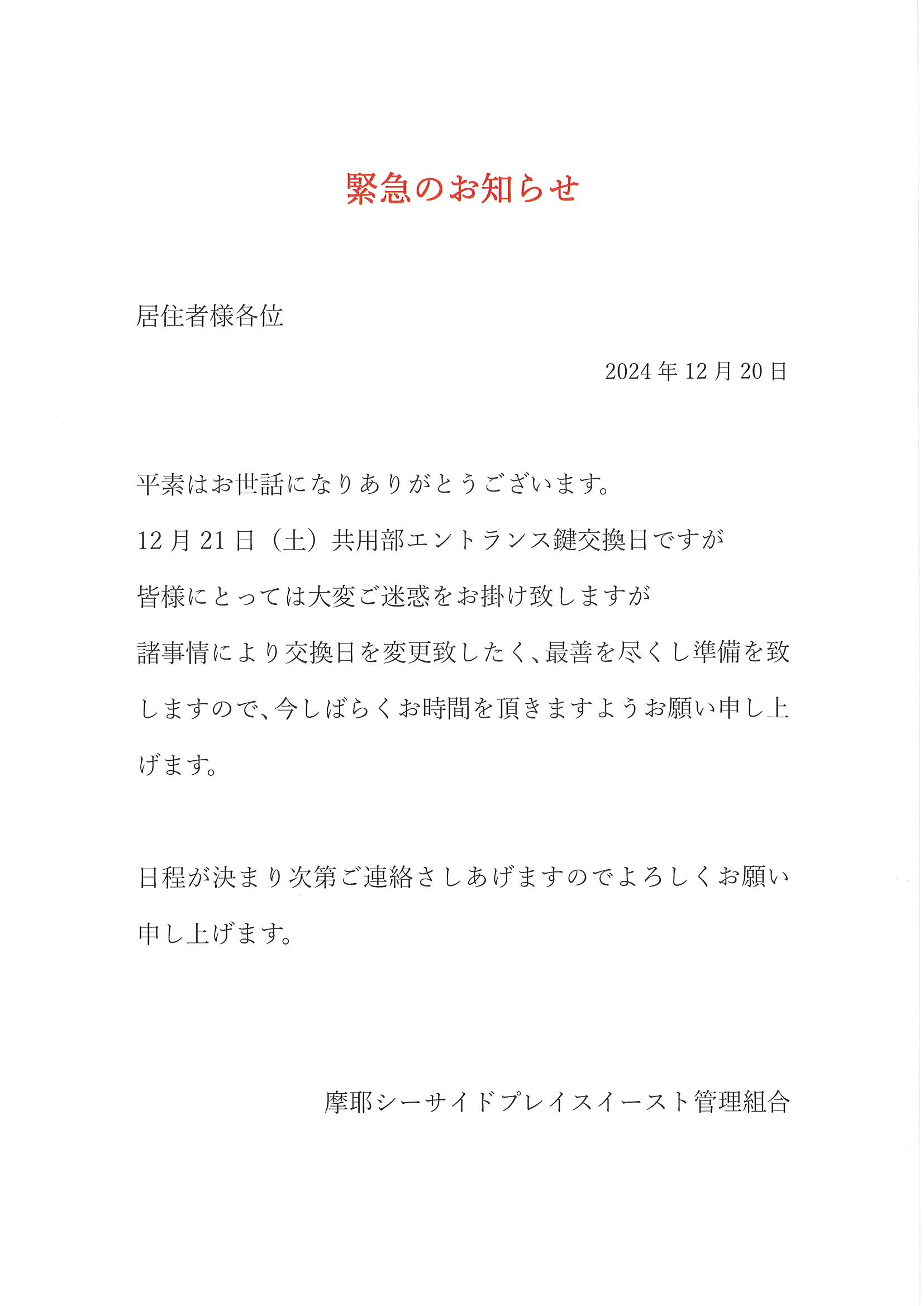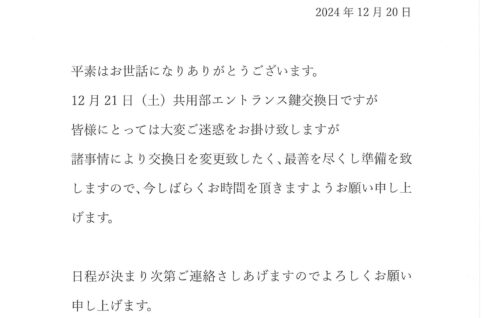 緊急のお知らせ/共用部エントランス鍵交換日変更