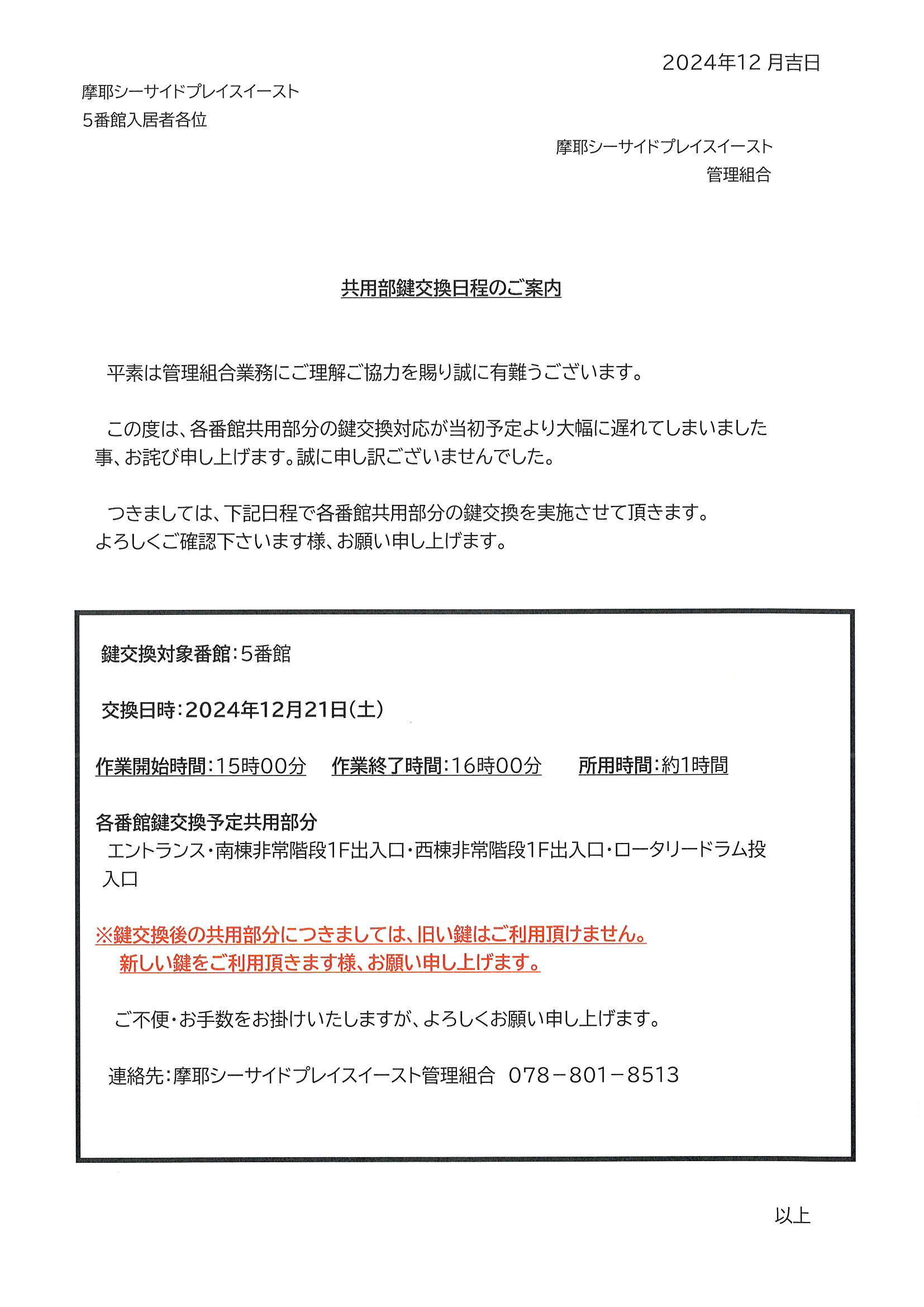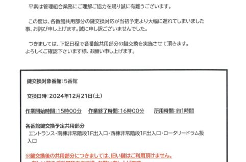 12月21日15:00~5番館共用部鍵交換日程のご案内