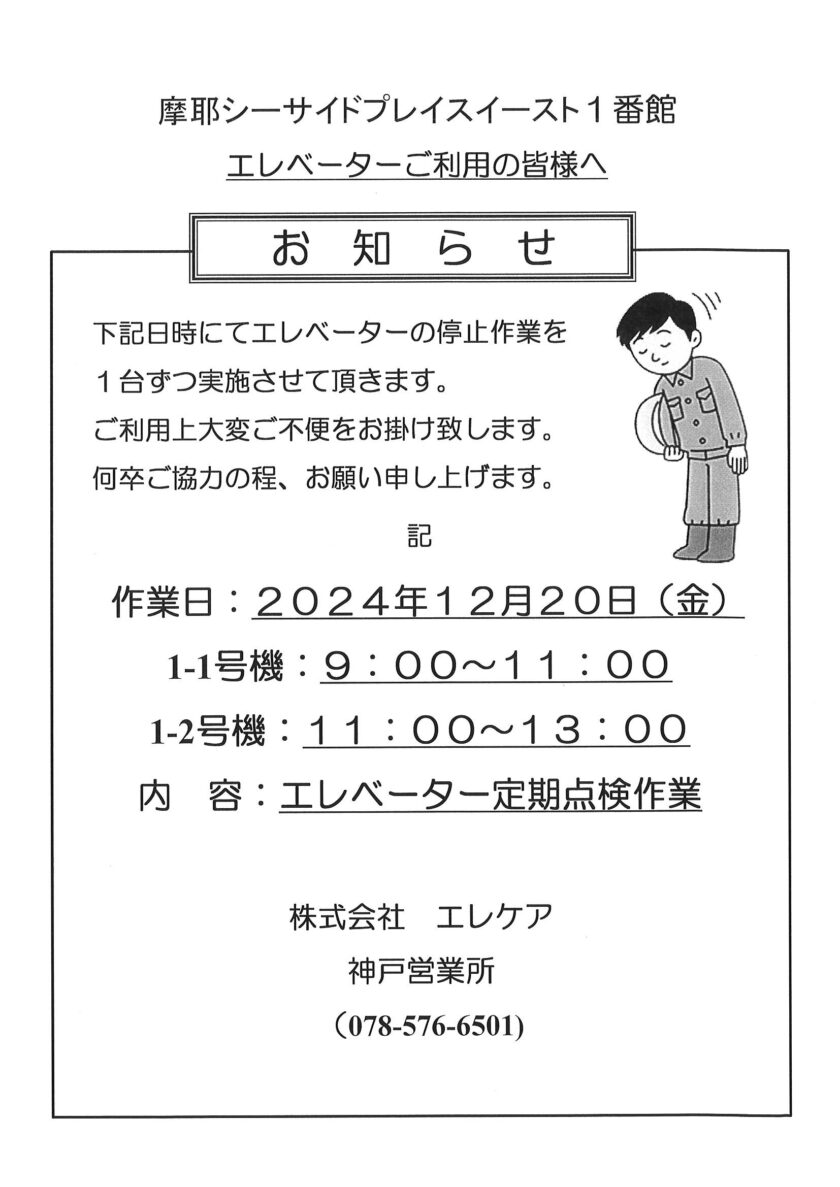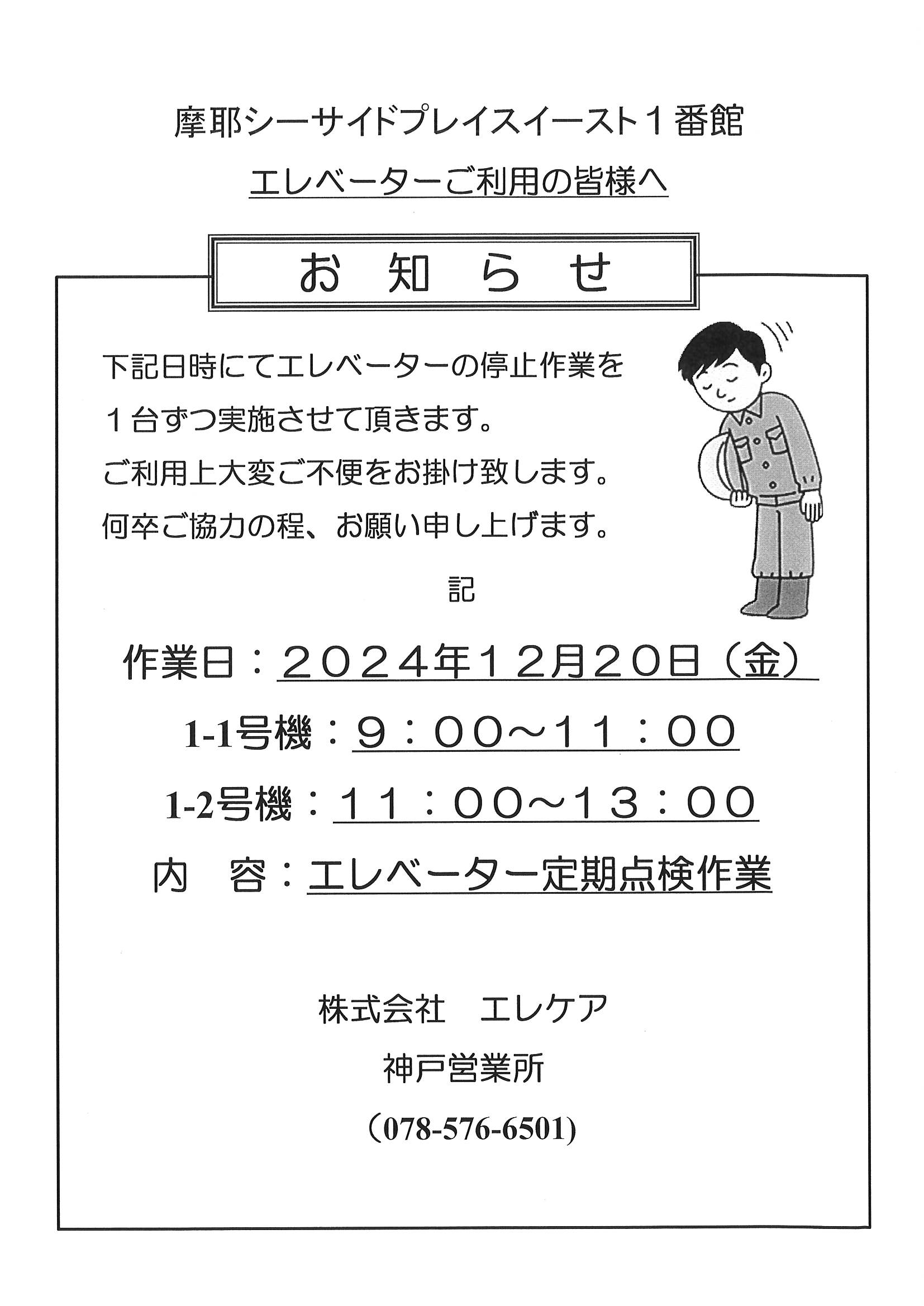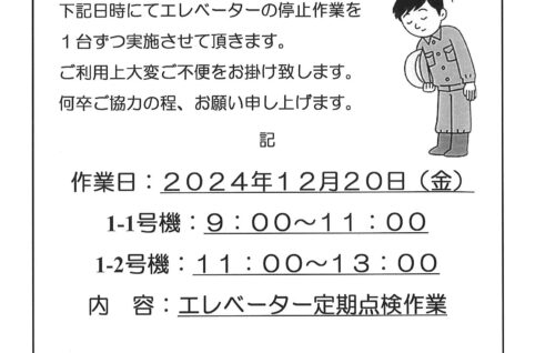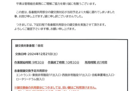12月21日9:30~1番館共用部鍵交換日程のご案内