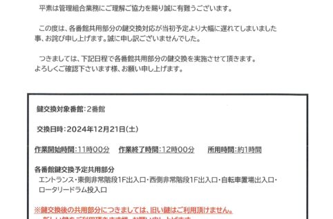 12月21日11:00~2番館共用部鍵交換日程のご案内