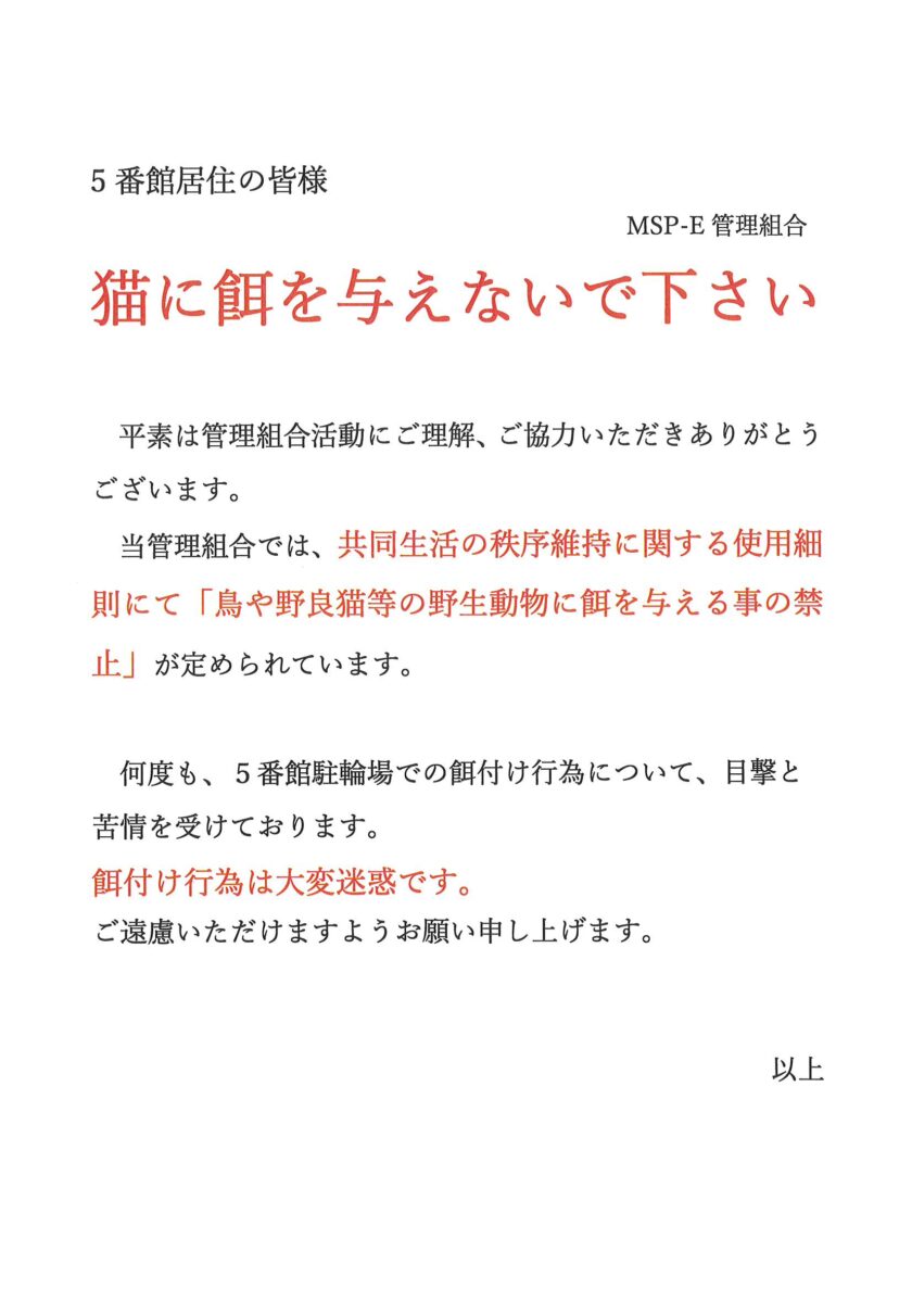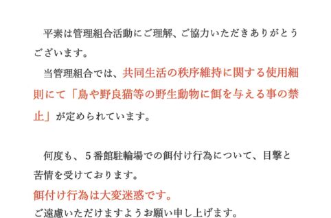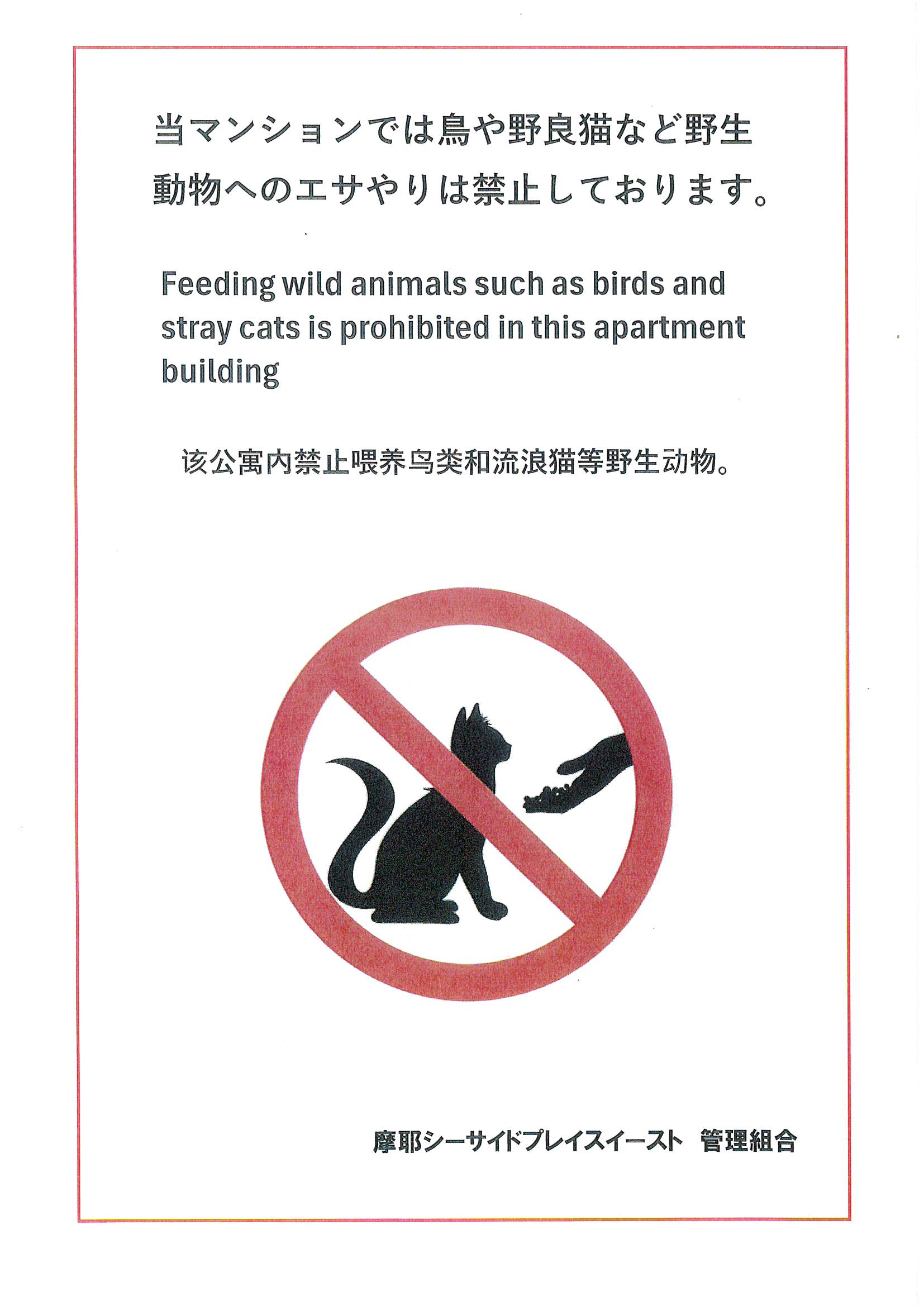 当マンションでは鳥や野良猫など野生動物のエサやりは禁止しております。