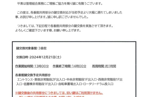 12月21日13:00~3番館共用部鍵交換日程のご案内