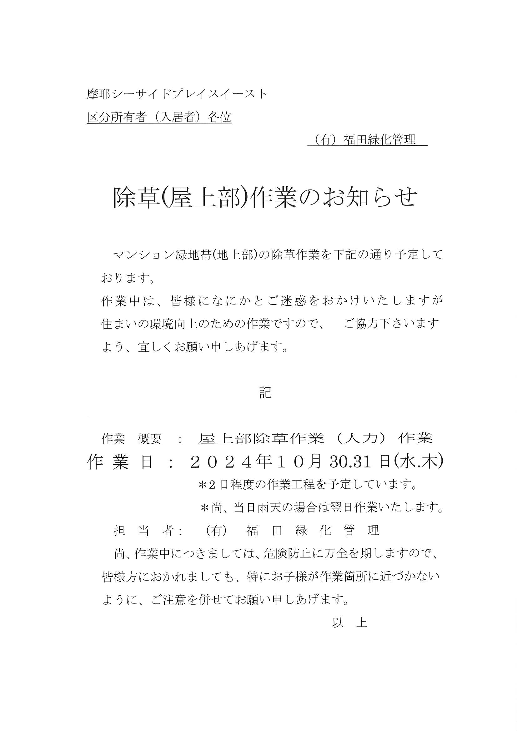 10月30,31日(水・木)除草(屋上部)作業のお知らせ