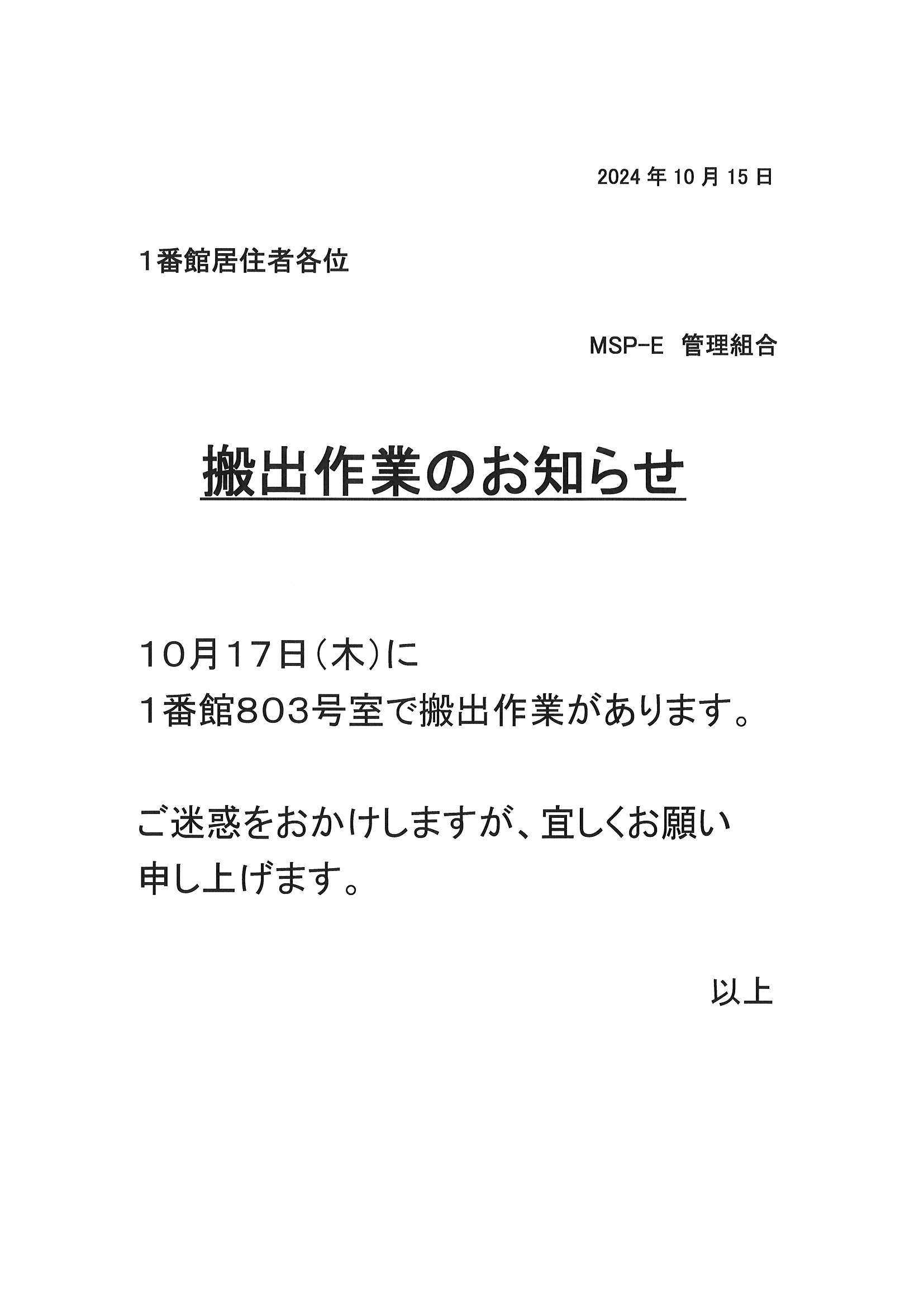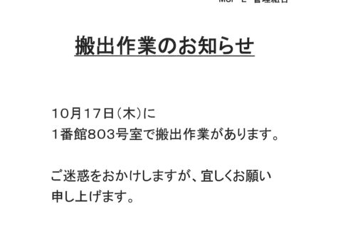 [1番館]搬出作業のお知らせ