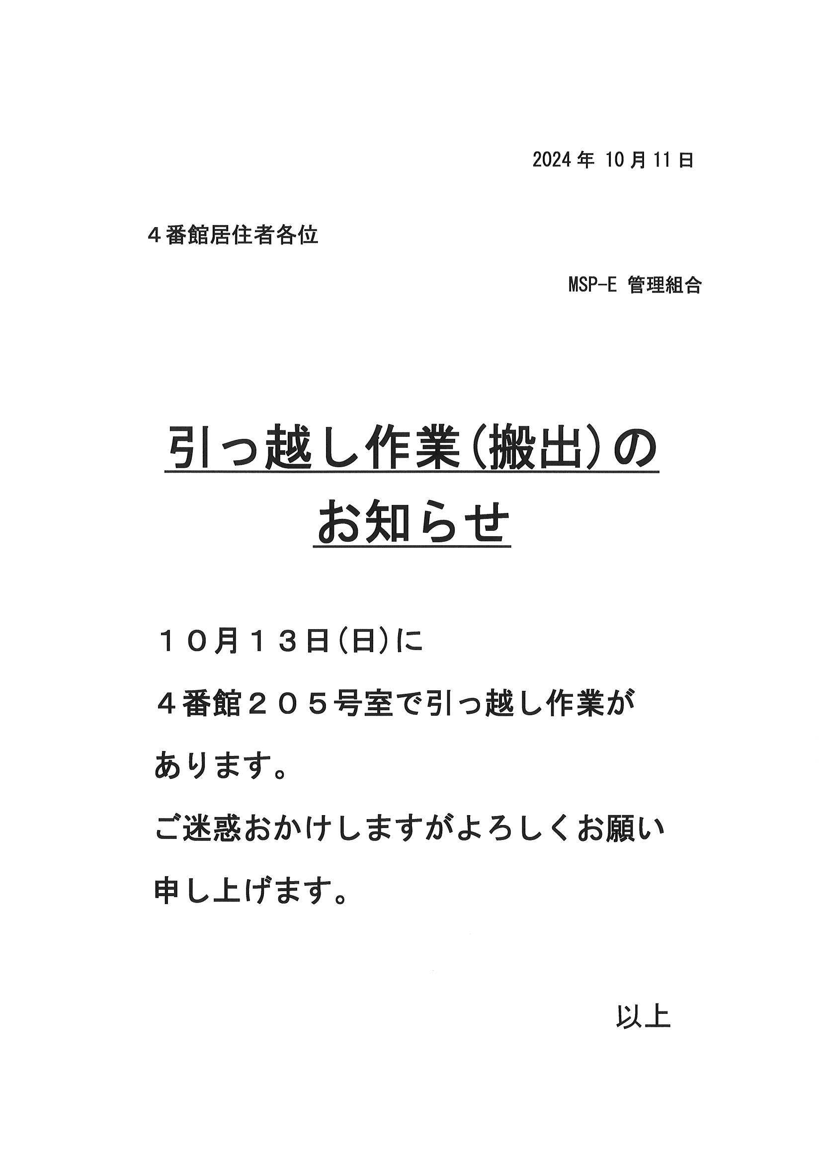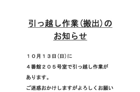 [4番館]引っ越し作業(搬出)のお知らせ