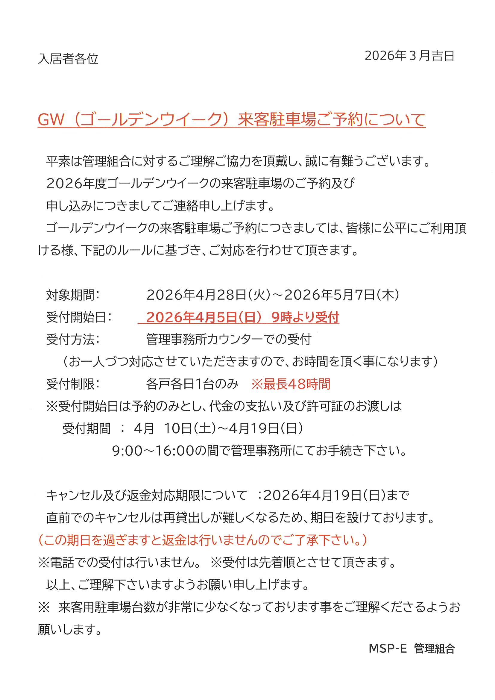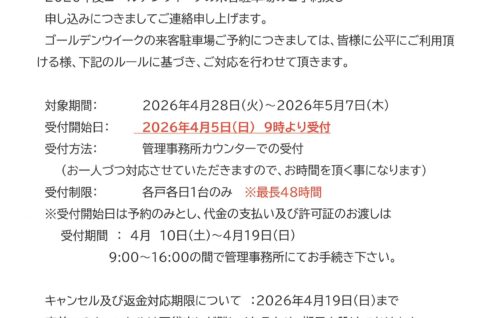 GW(ゴールデンウイーク)来客駐車場ご予約について