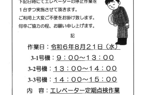 【3番館】エレベーター定期点検作業のお知らせ