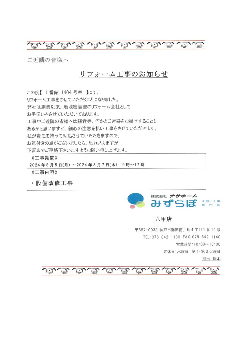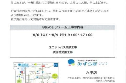 【1番館】リフォーム工事のお知らせ
