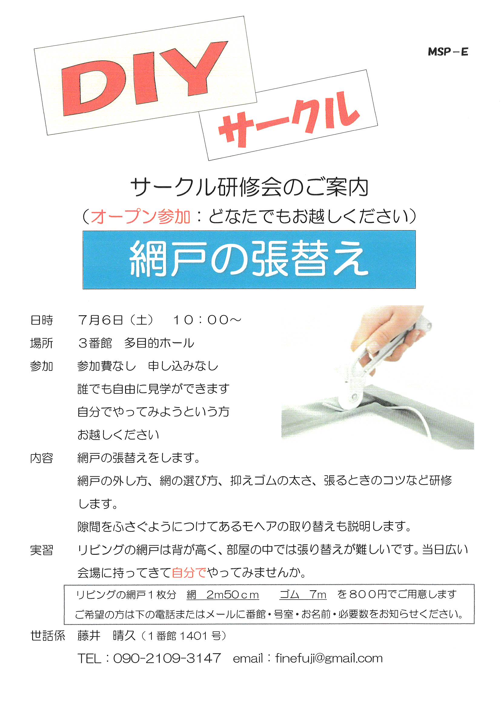 7月6日「DIYサークル 網戸の張替え」