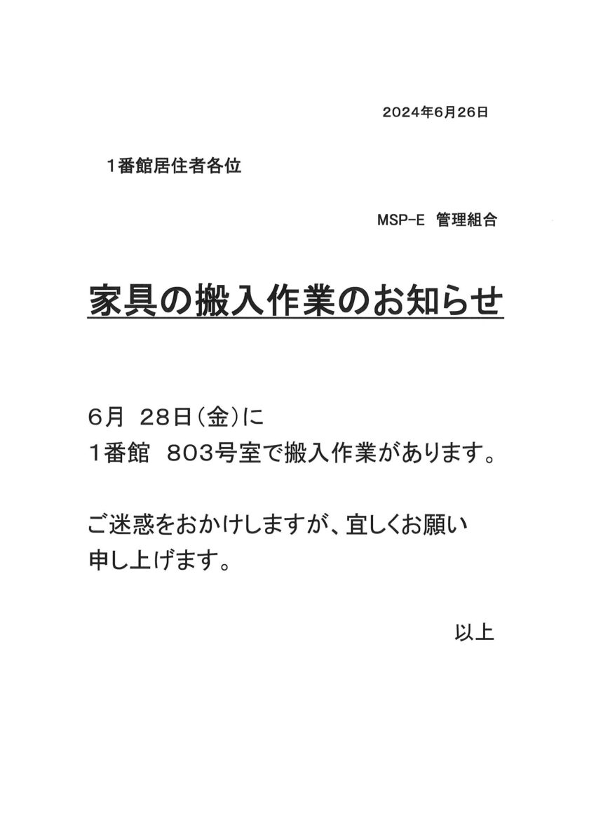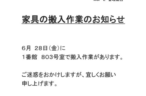 [1番館]家具の搬入作業のお知らせ