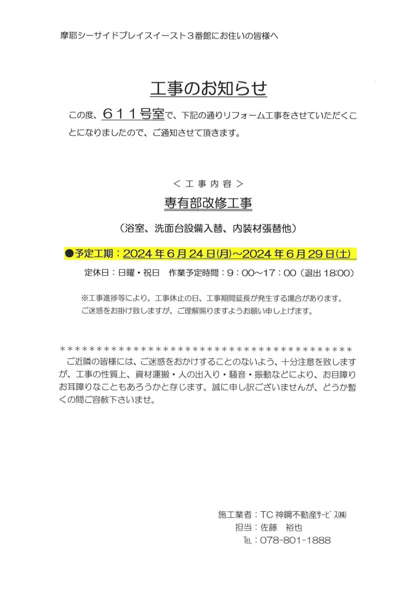 [3番館]リフォーム工事のお知らせ