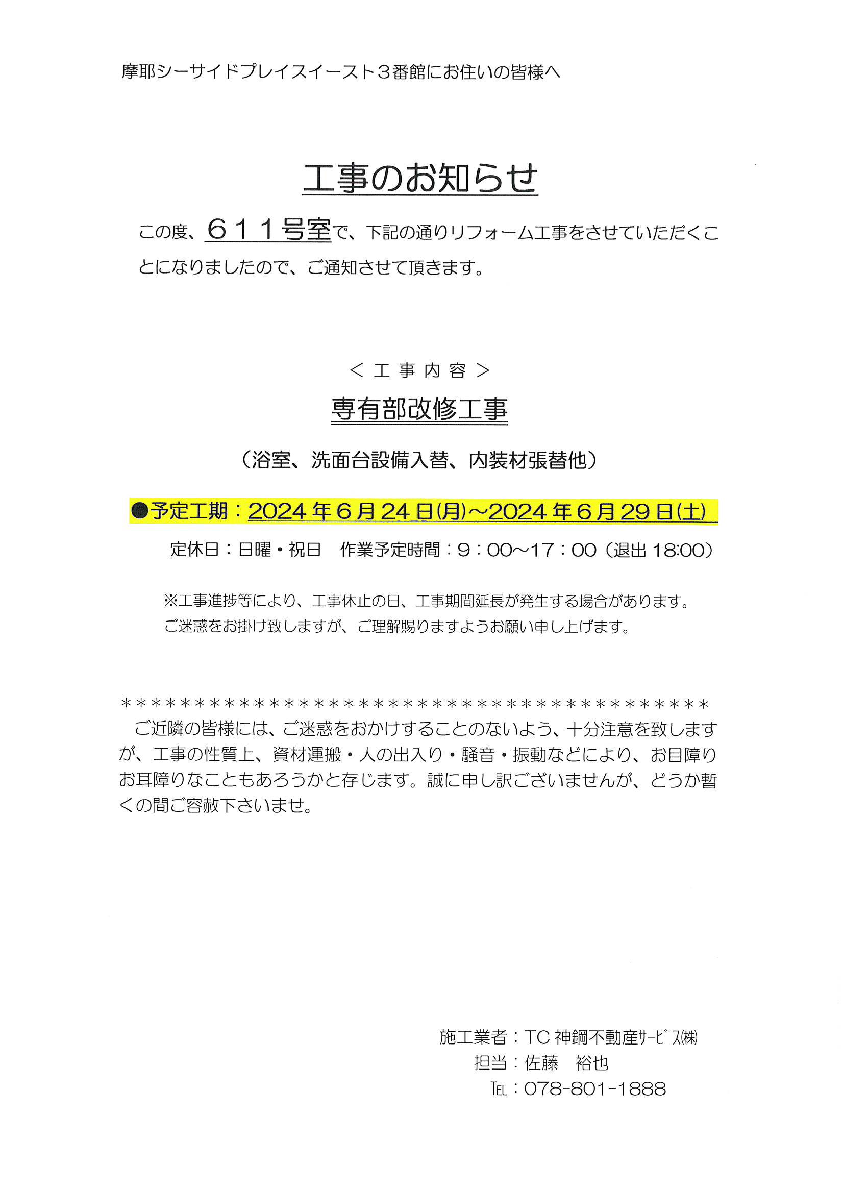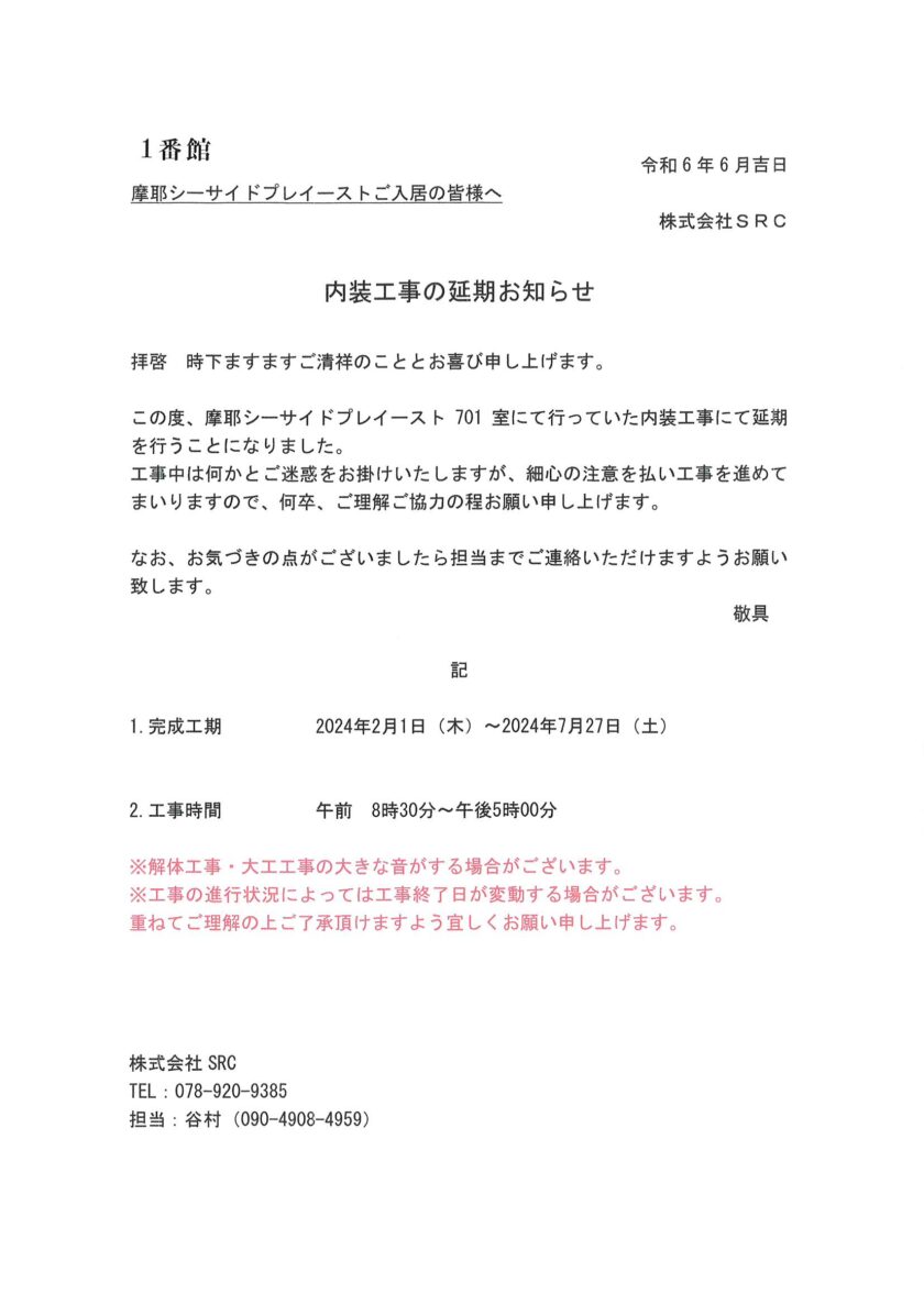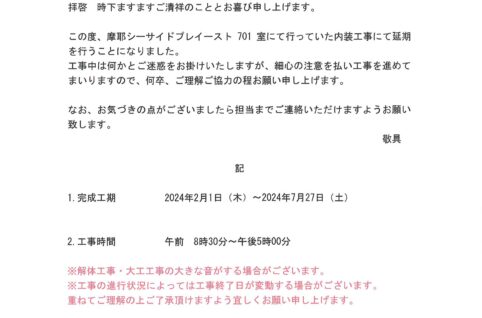 [1番館]リフォーム工事延長のお知らせ