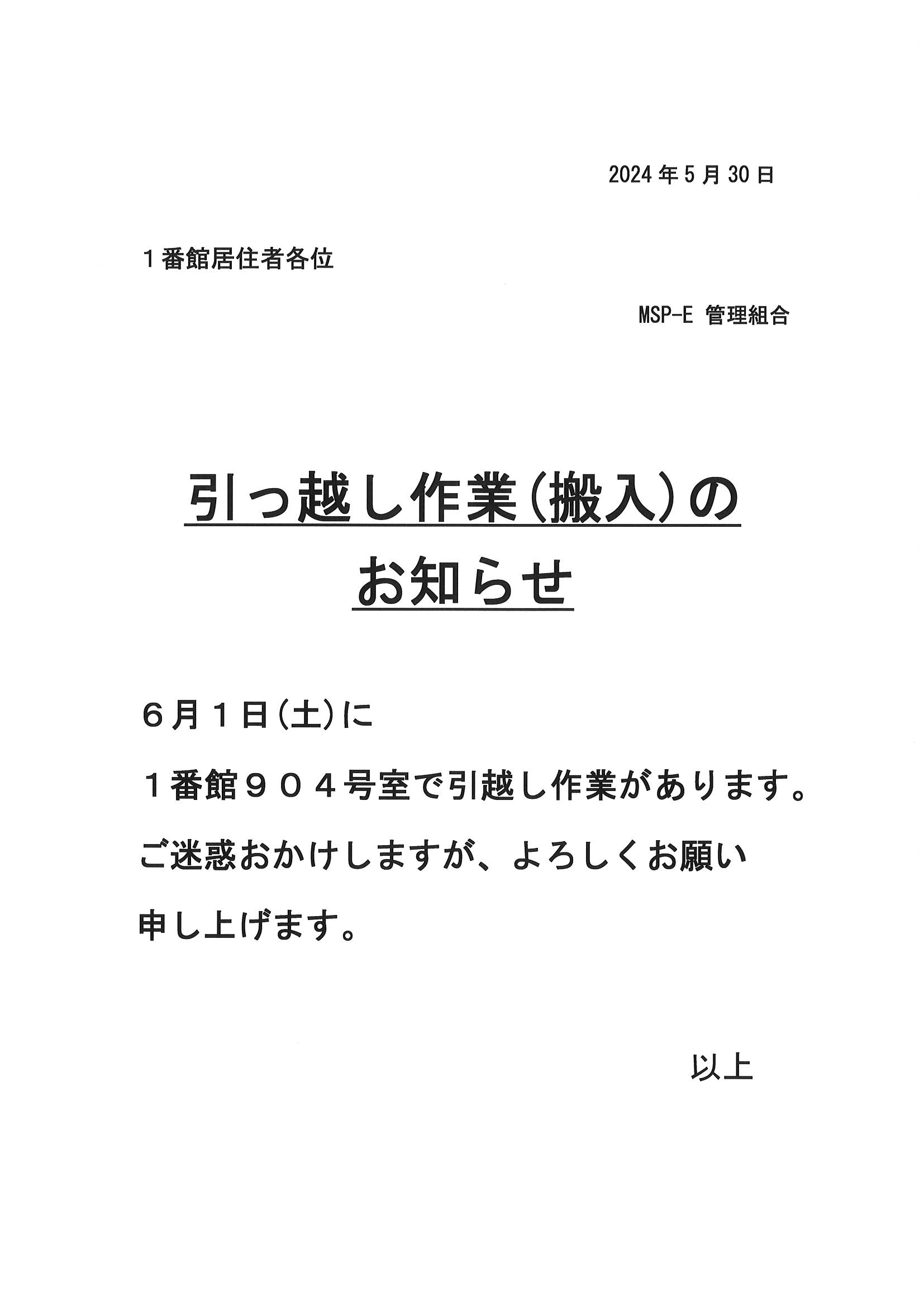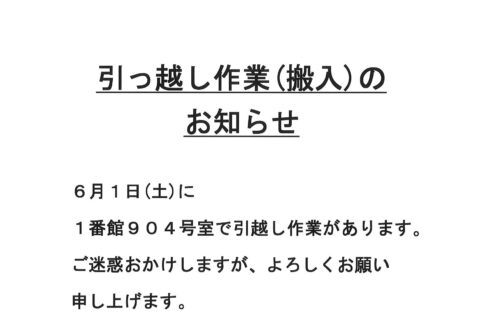 [1番館]引っ越し作業(搬入)のお知らせ
