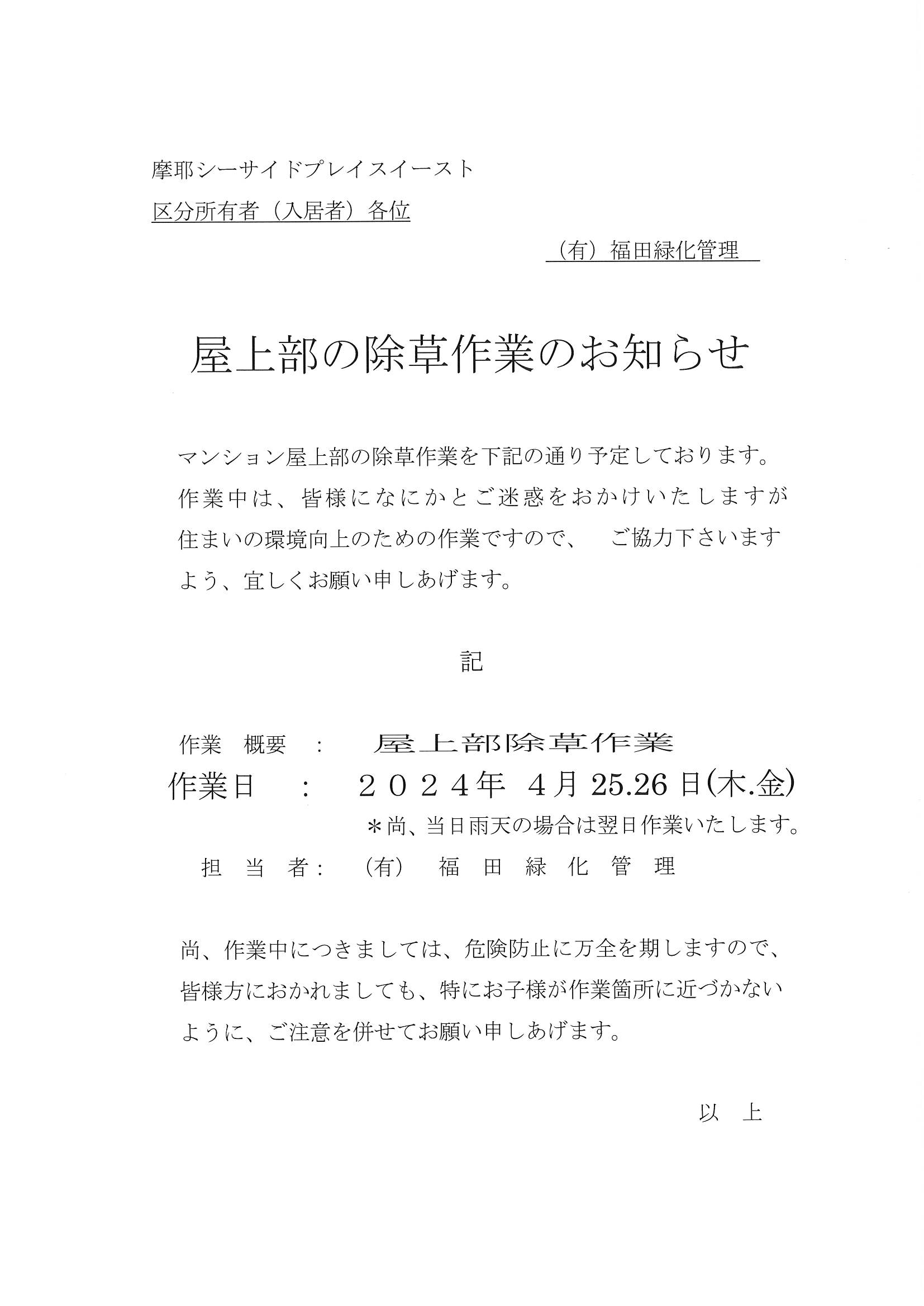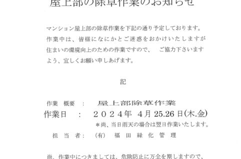 4月25,26日/屋上部の除草作業のお知らせ