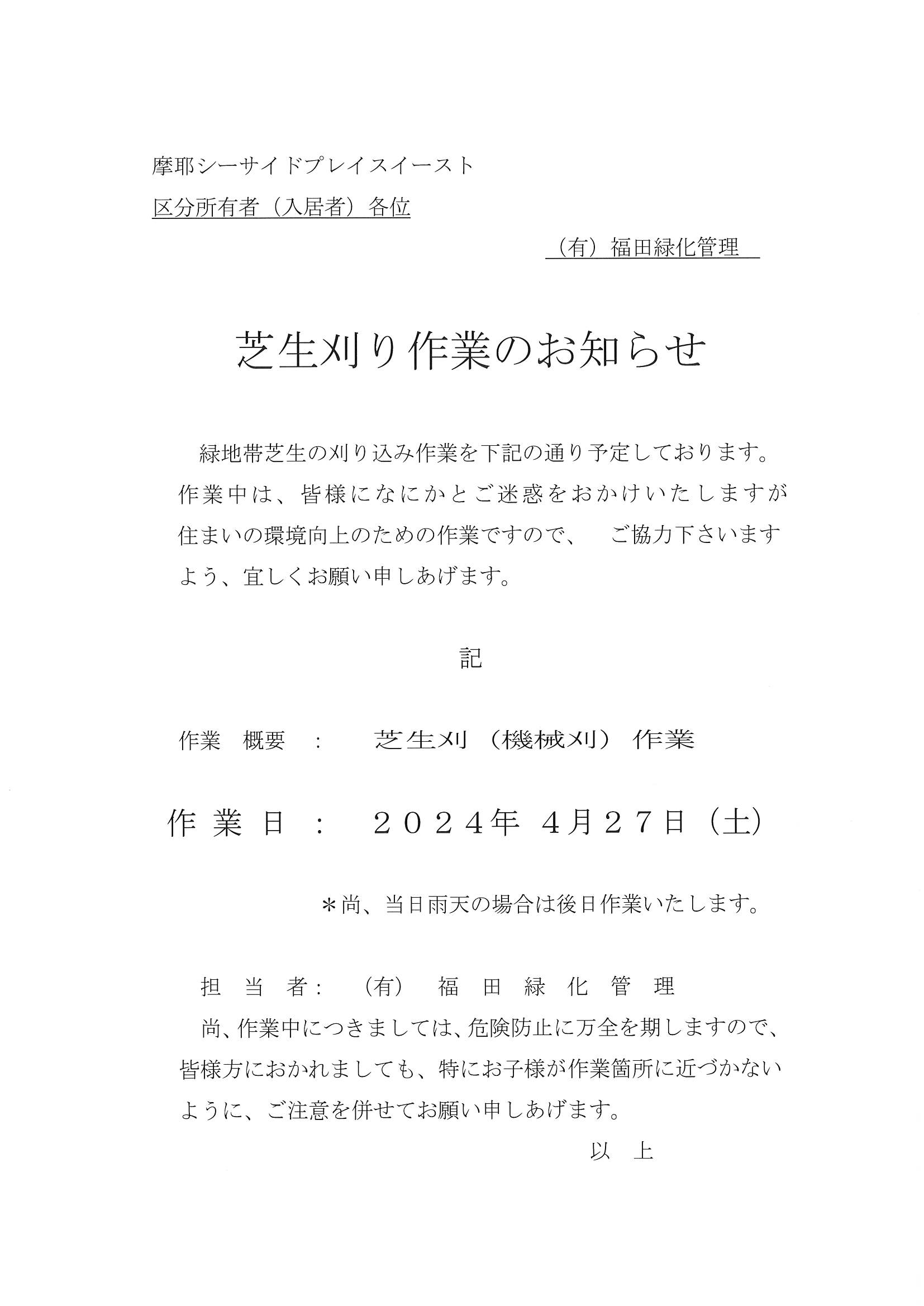 4月27日/芝生刈り作業のお知らせ