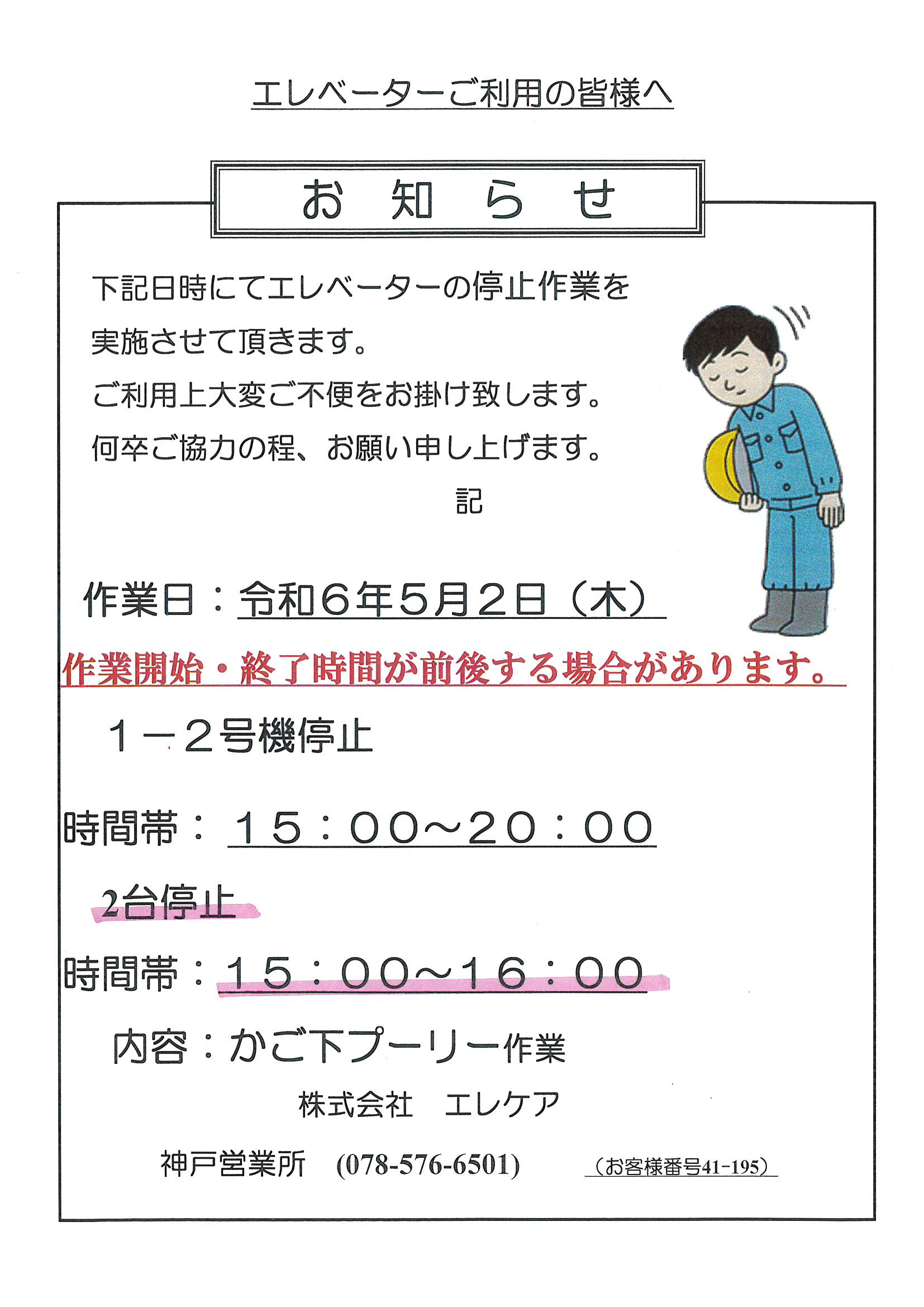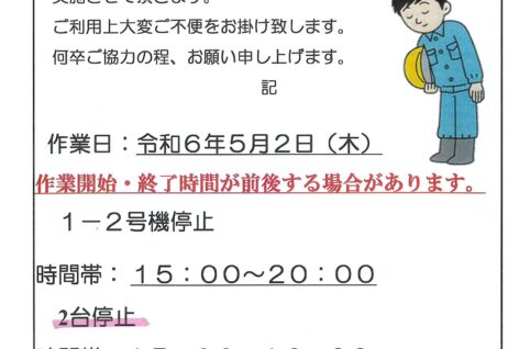 1番館エレベーター復旧作業に伴う停止のお知らせ