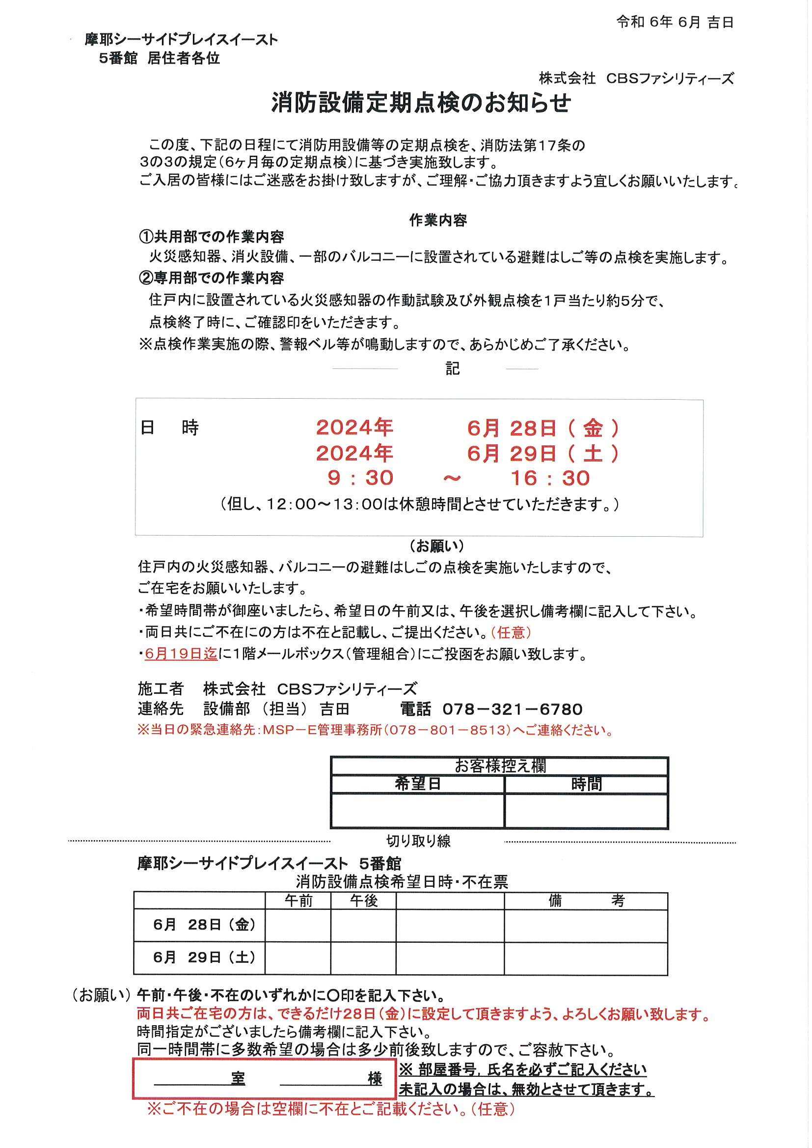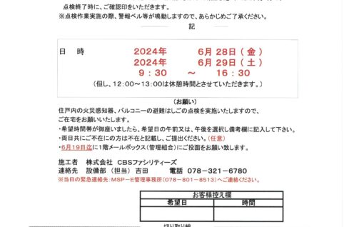 【5番館消防設備定期点検のお知らせ】