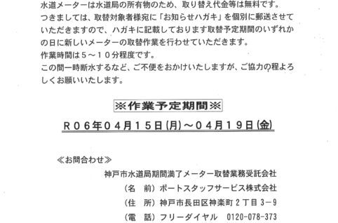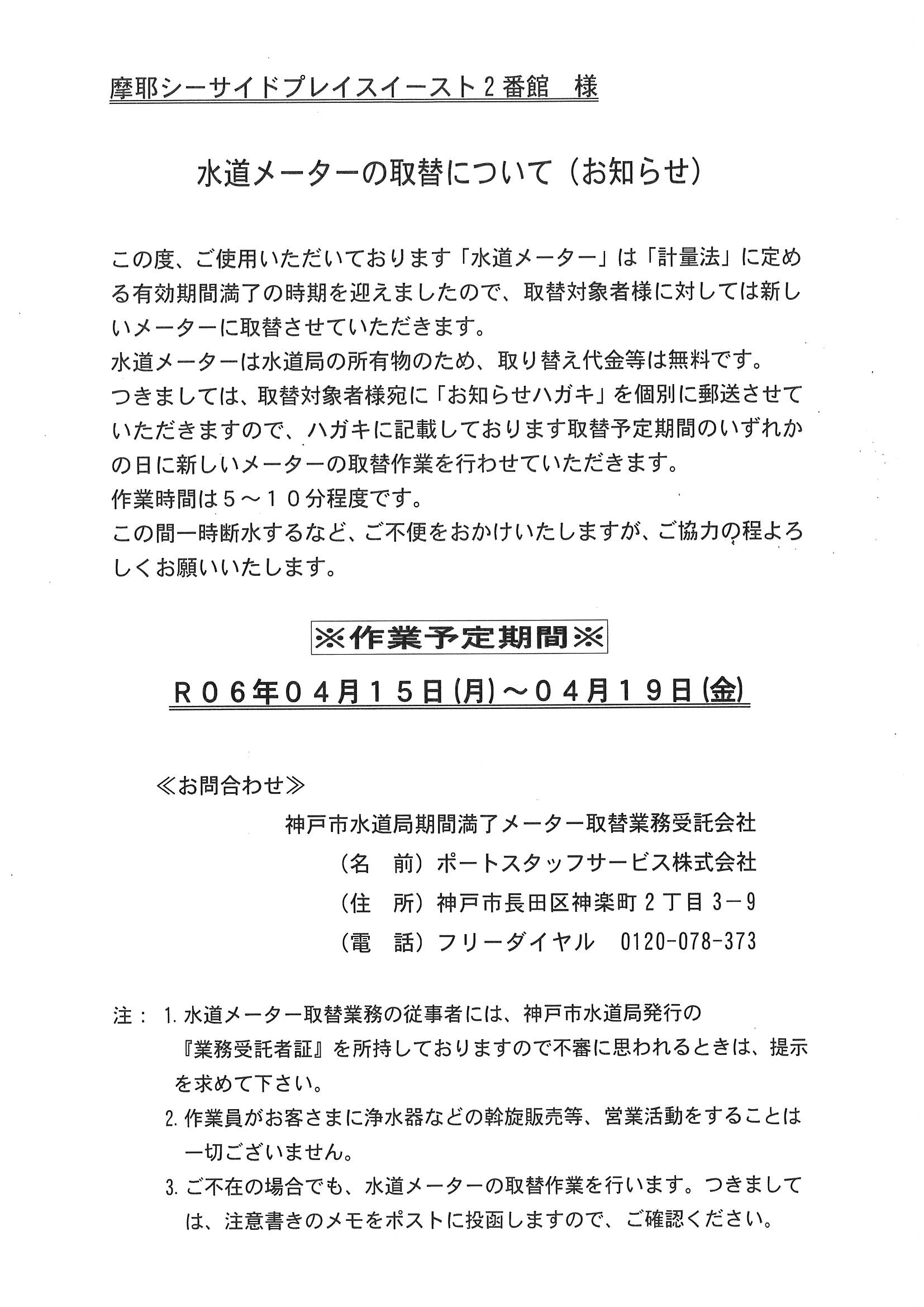4月15日~19日 2番館・3番館水道メーターの取替について