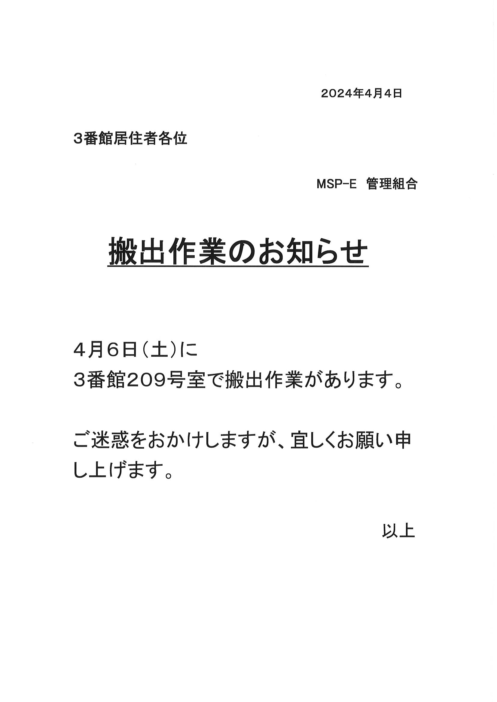[3番館]搬出作業のお知らせ