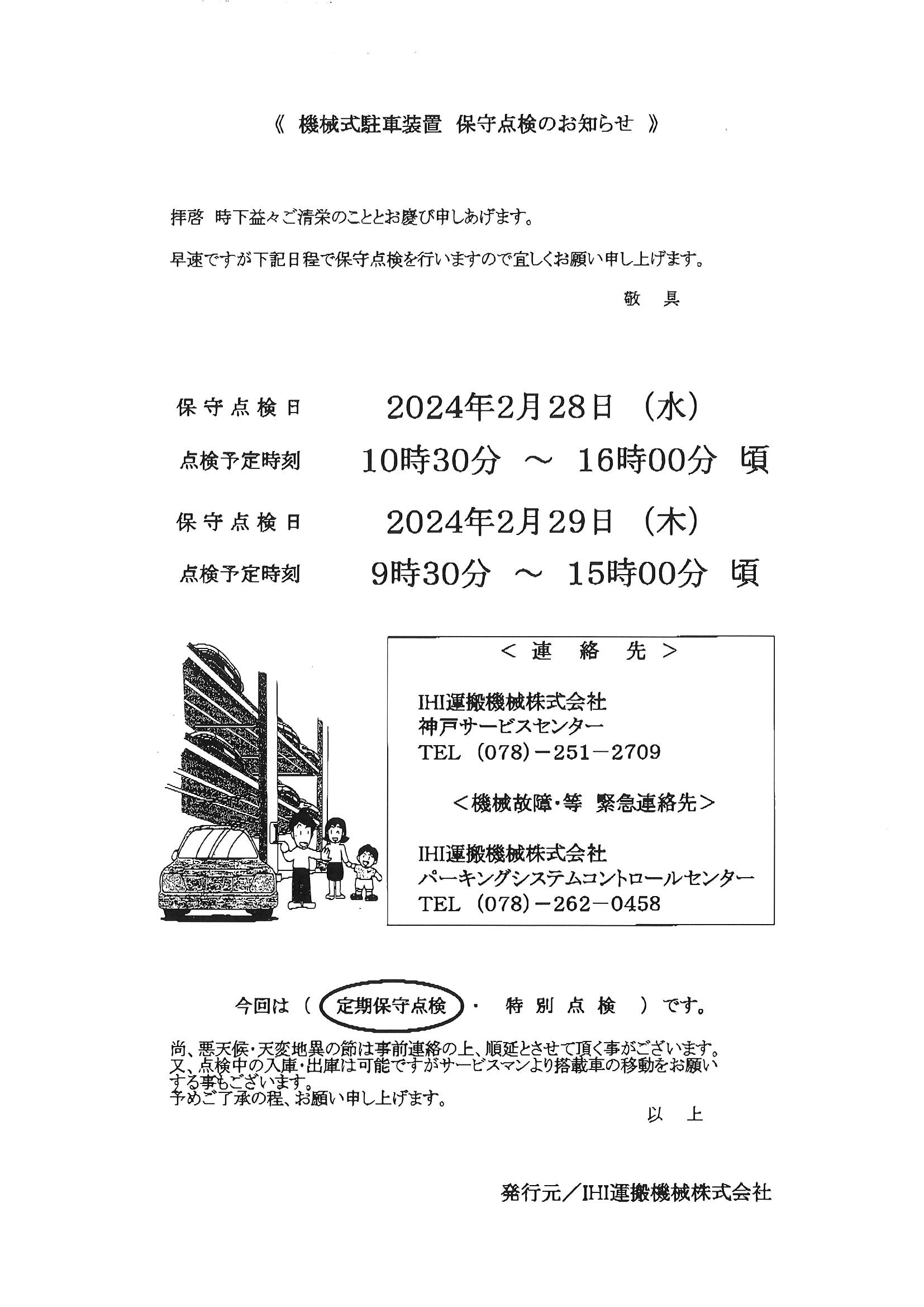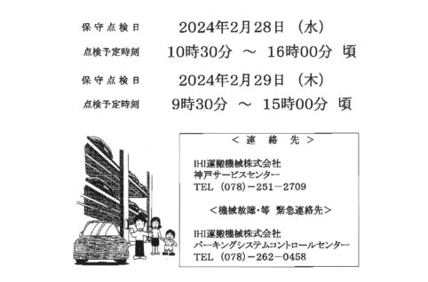 2/28・29機械式駐車場装置 保守点検のお知らせ