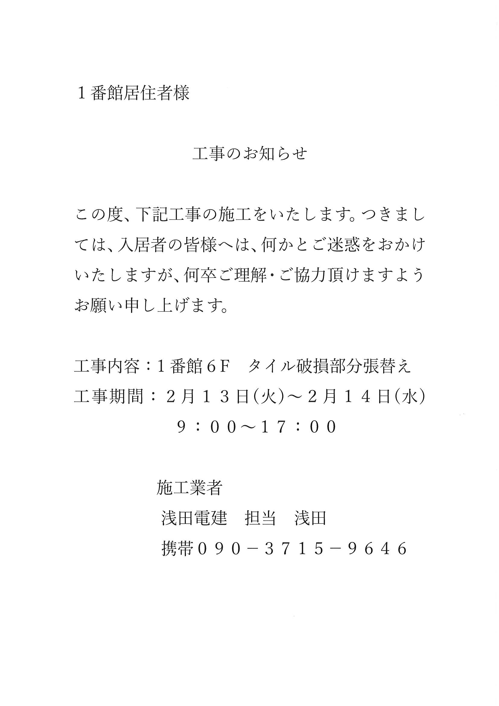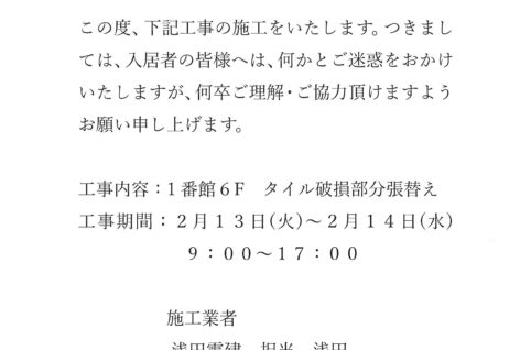 1番館6Fタイル交換工事のお知らせ
