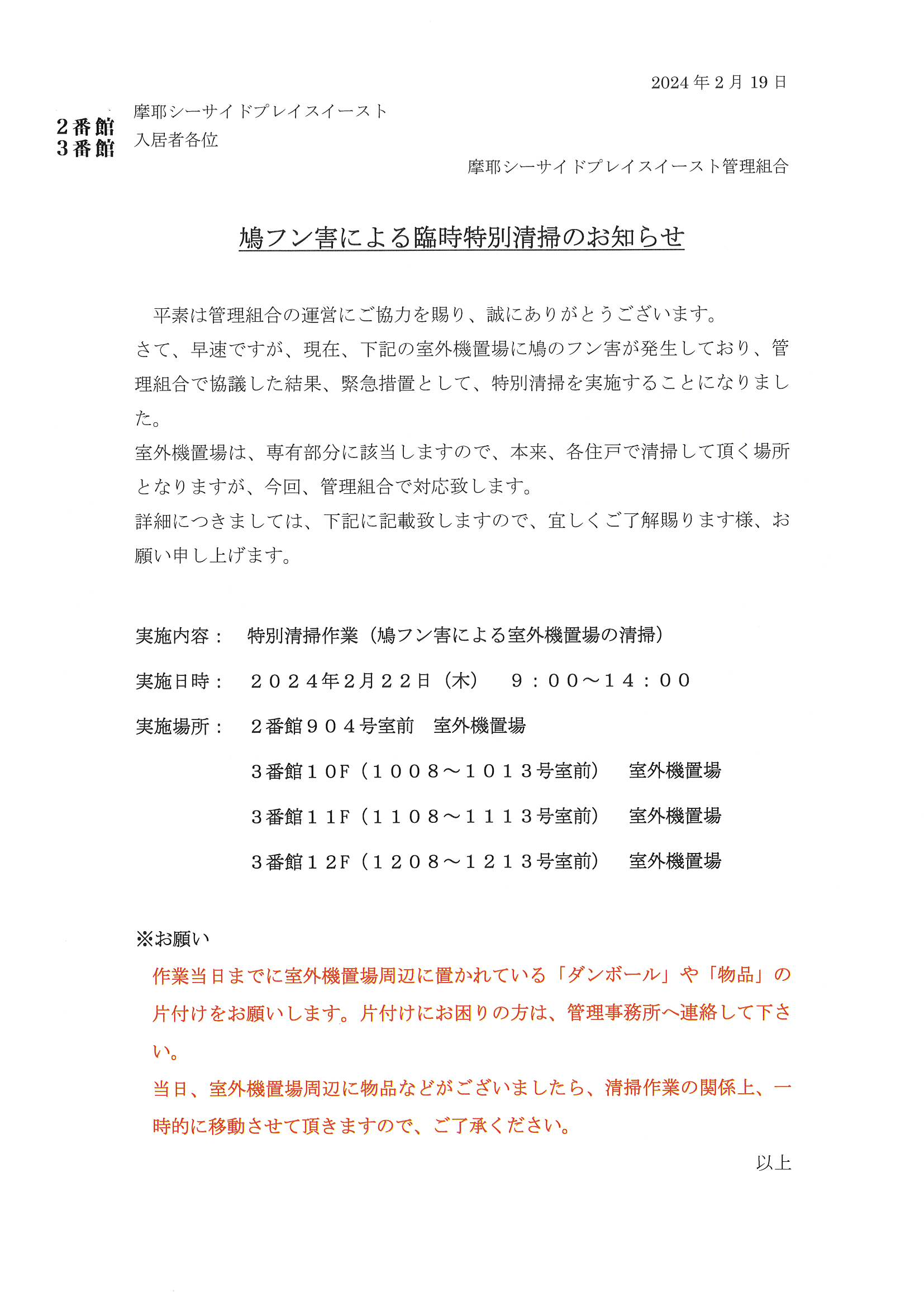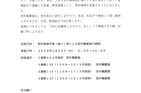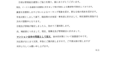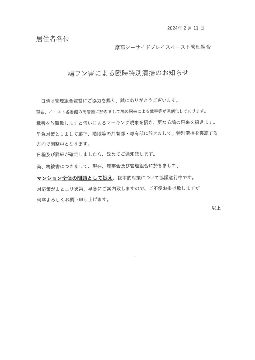 鳩フン害による臨時特別清掃のお知らせ