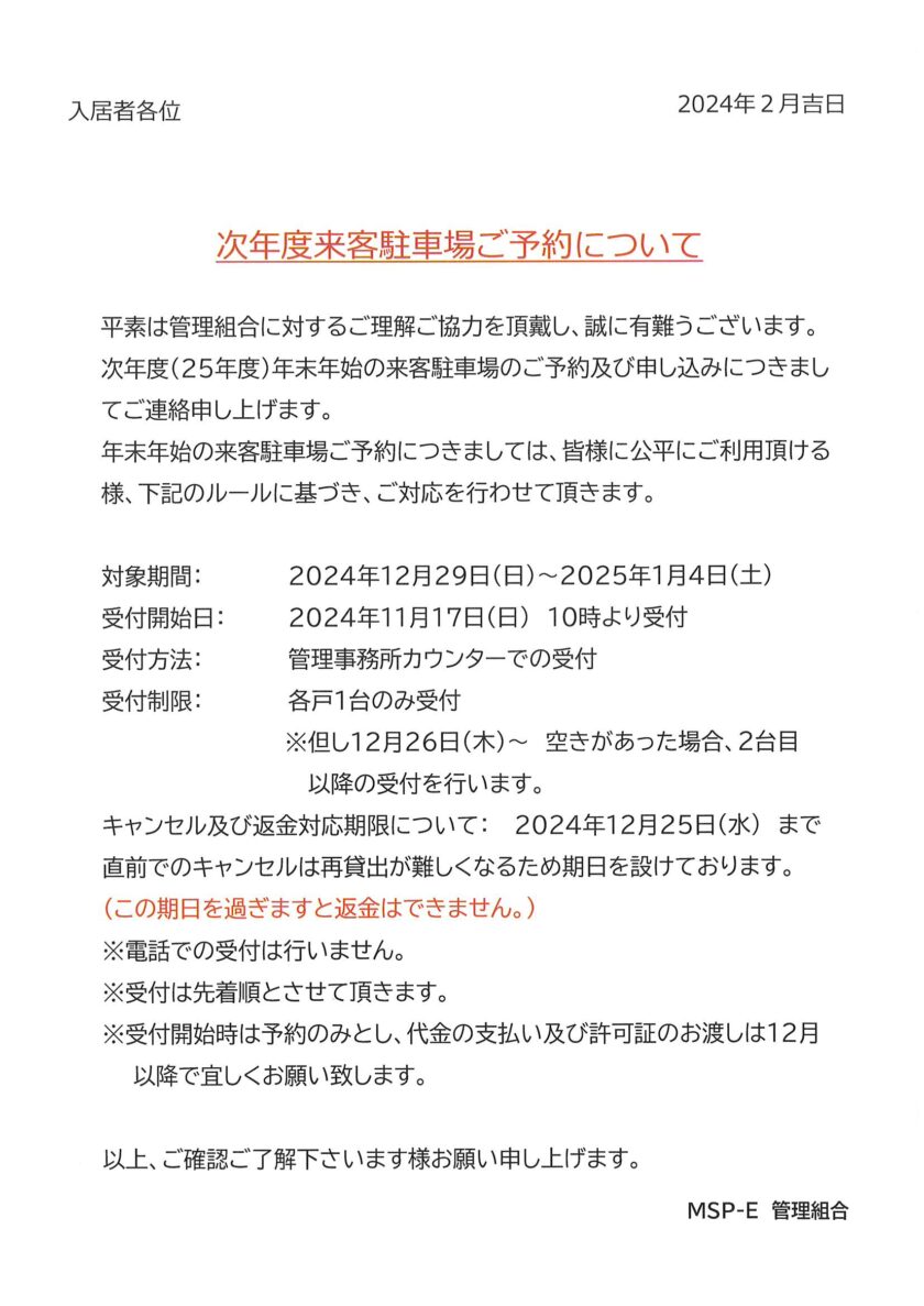 次年度来客駐車場ご予約について