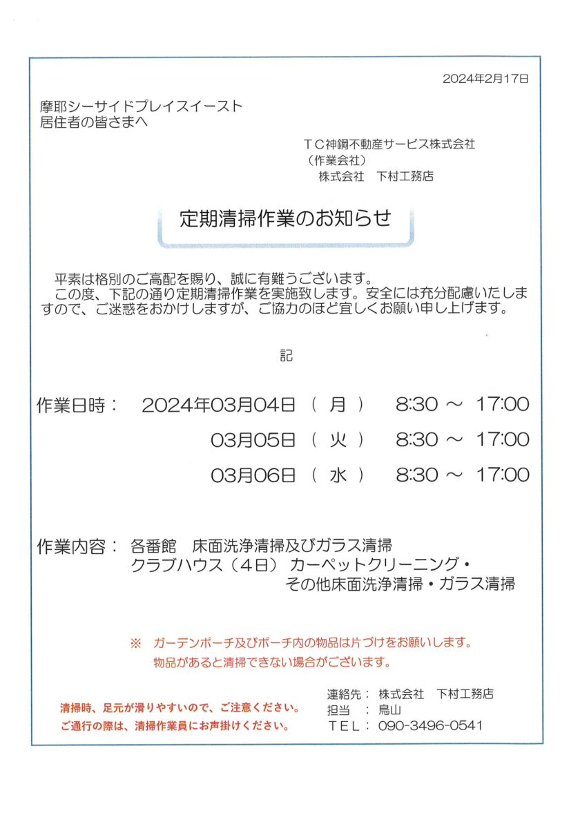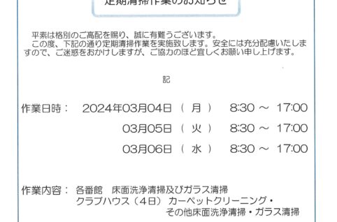 3/4~3/6 定期清掃作業のお知らせ